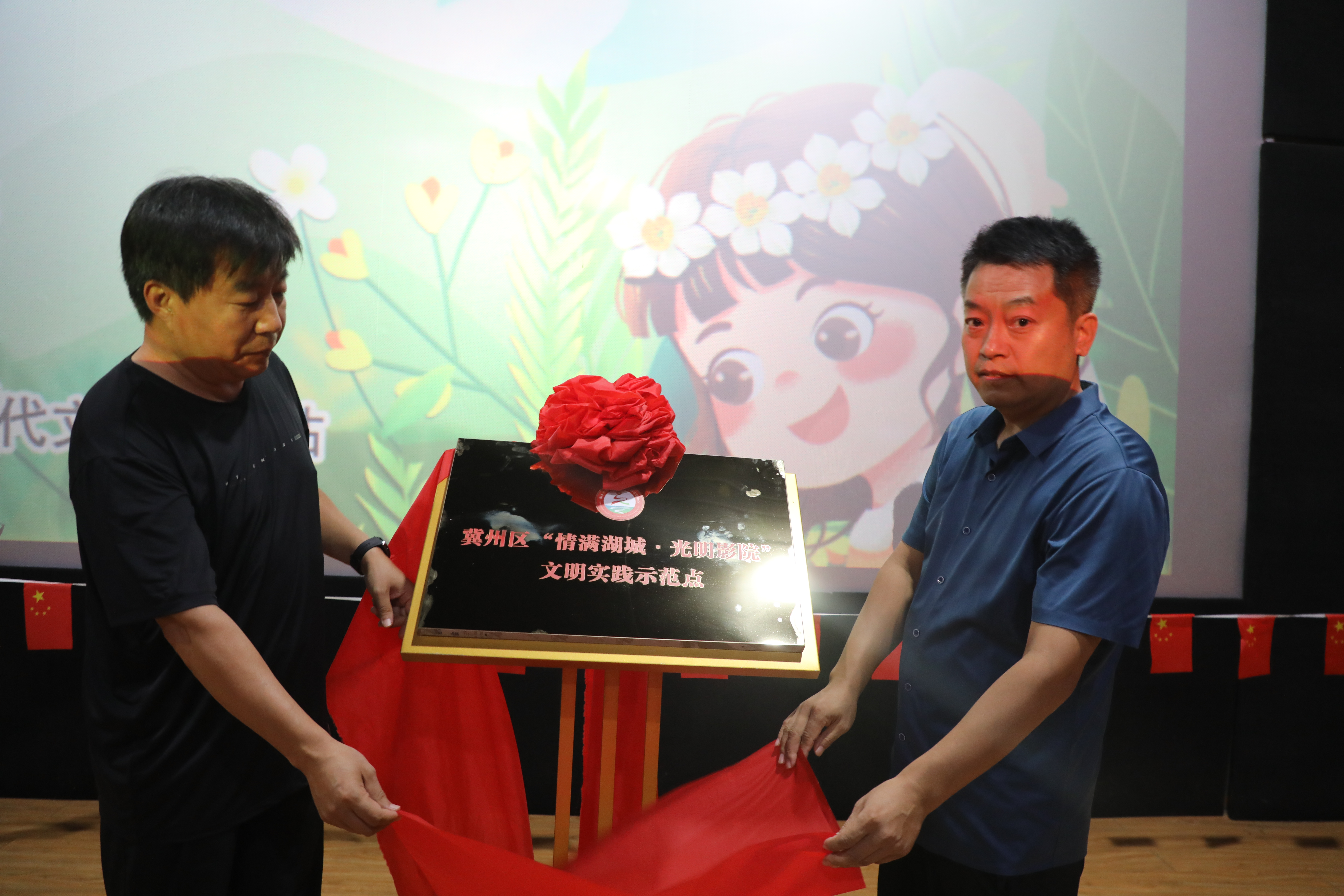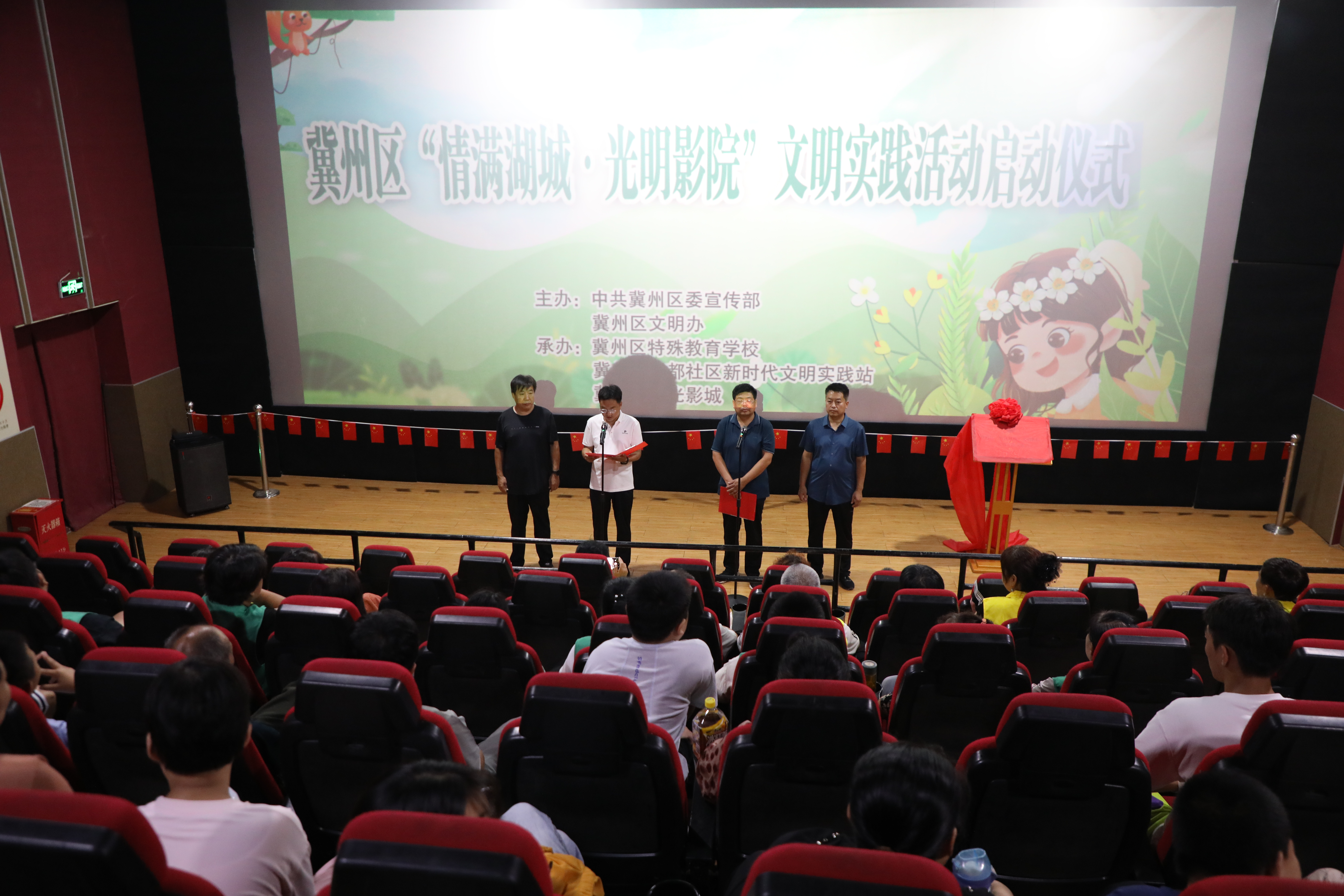 本次活动由冀州区委宣传部、区文明办主办,区特殊教育学校、信都社区新时代文明实践站、冀州区时光影城承办。启动仪式现场,随着“冀州区新时代文明实践点”在时光影城揭牌,首批视障人士在现场指导老师和爱心志愿者的搀扶下,走进影院并有序落座,共同“观看”了《夏季成长记》无障碍电影。