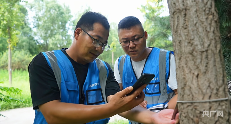 护林员正在监测“千年秀林”树木的生长情况(央广网记者 王艺霖 摄)