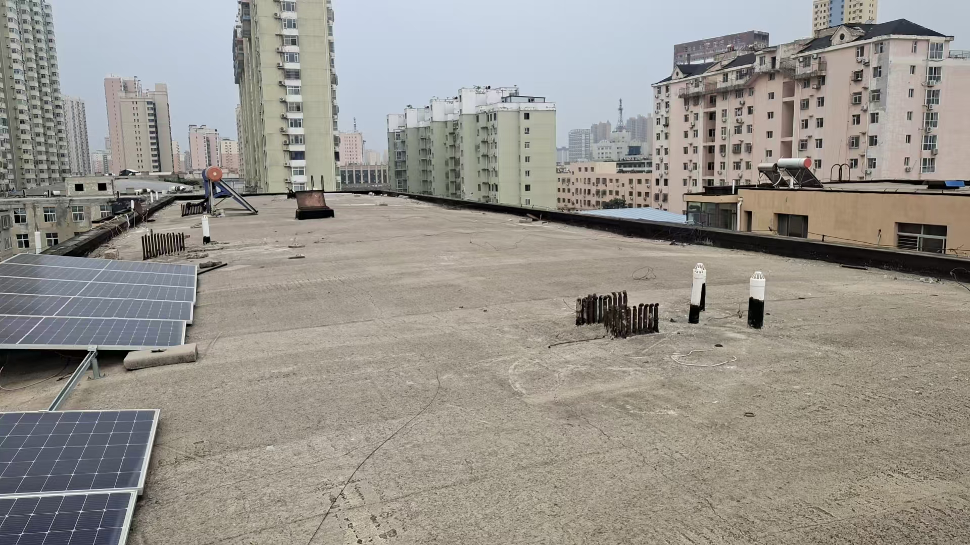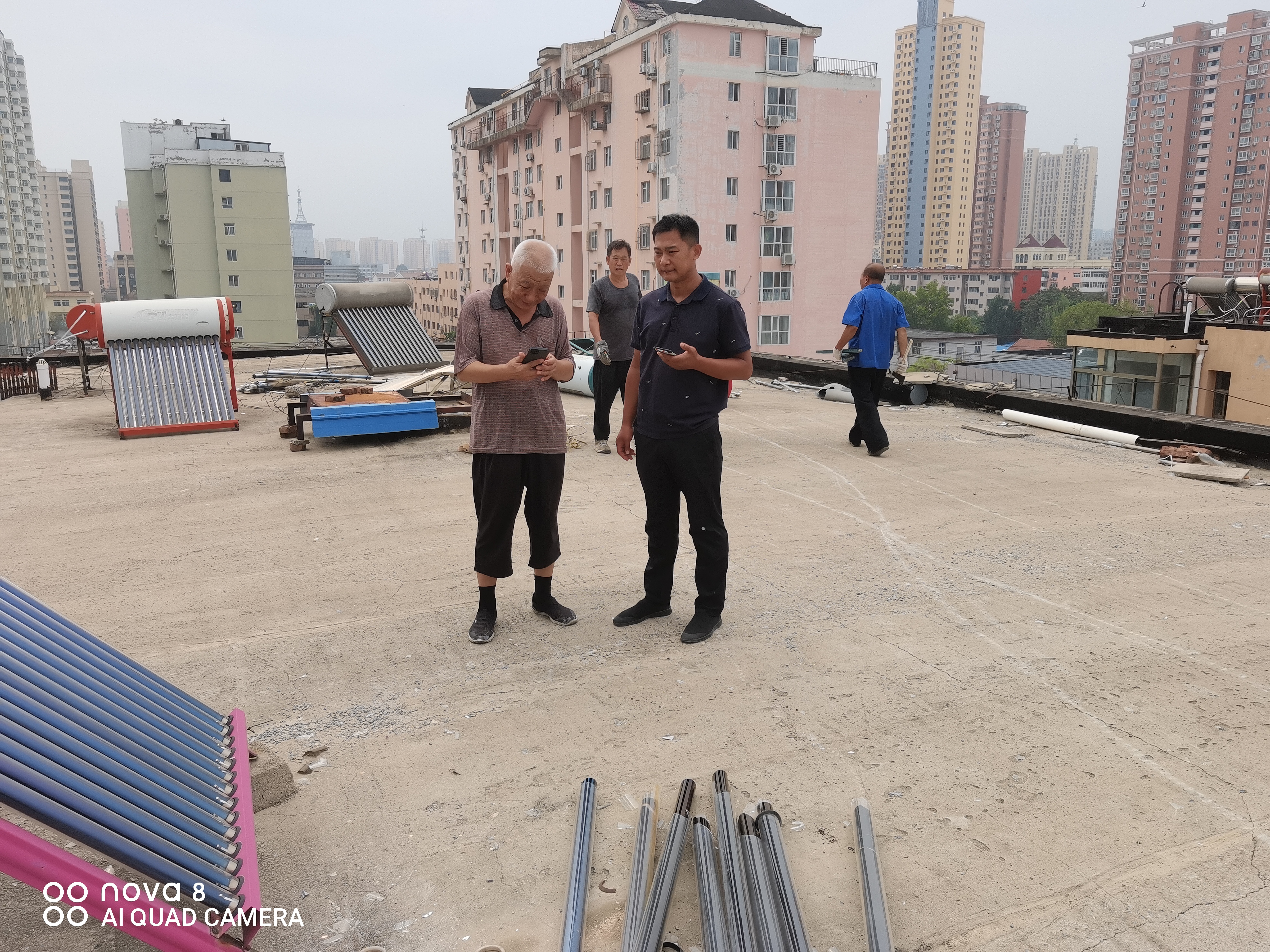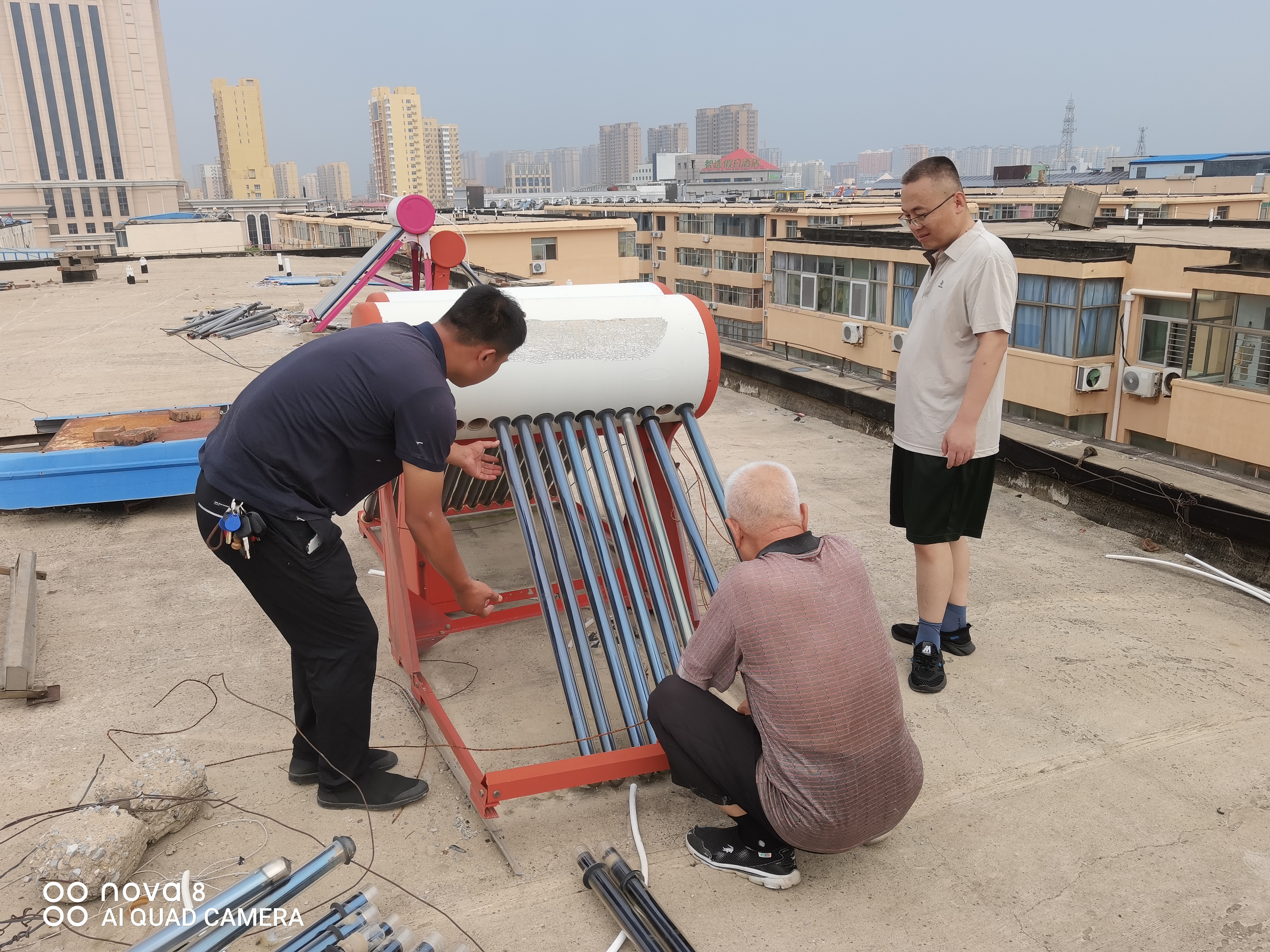 行动当天,专业施工人员携带设备登上楼顶。他们顶着高温,在狭窄的平台上精准作业。对完全废弃、锈蚀严重、存在倾倒风险的太阳能设备进行安全拆除和清运;对仍在使用的设备则进行全面检查和加固,确保稳固可靠。经过紧张有序的工作,40多个“隐患源”被彻底清除,10多个在用设备得到加固,楼顶面貌焕然一新。