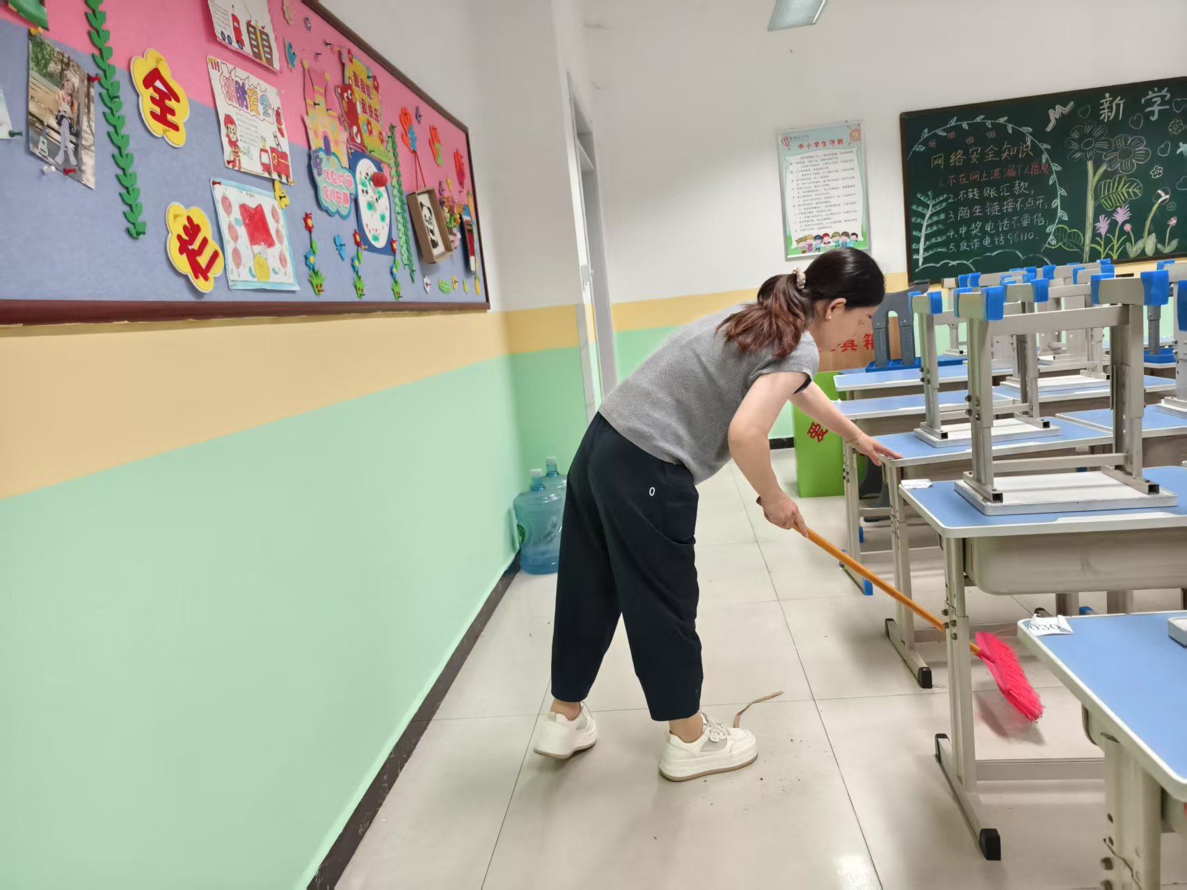 景县第五小学的教室里,老师们化身“清洁能手”,挥扫帚、拖地面,把假期积攒的灰尘彻底扫净,黑板上更精心制作了黑板报,走进教室,浓浓的开学氛围便扑面而来。
