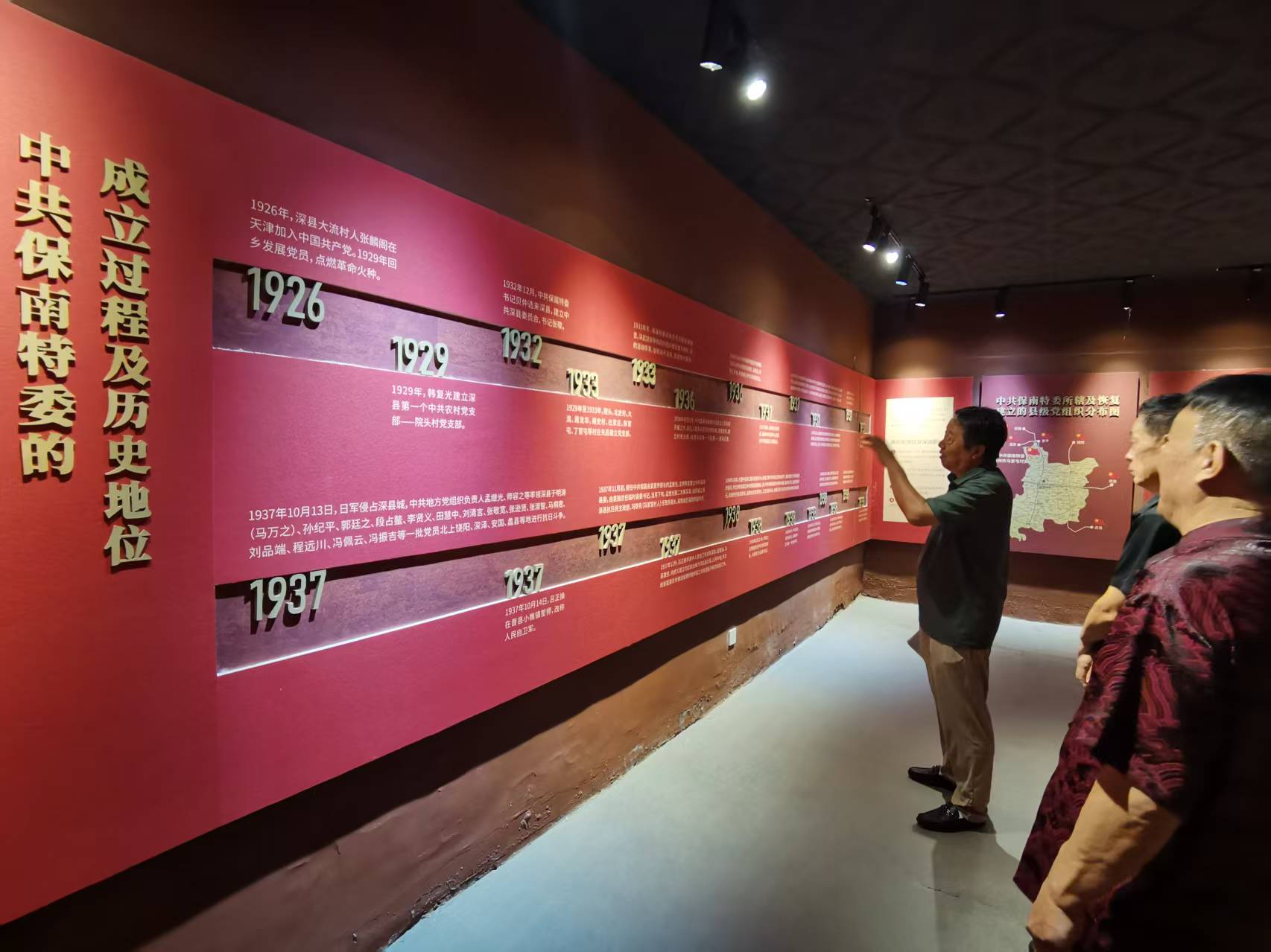 座谈会上的众人移步纪念馆。馆内展陈内容翔实丰富,极具历史价值。20余块图文并茂的展板,详细梳理了中共保南特委的成立背景、历史沿革、组织体系和主要活动,清晰展现了其在冀中抗战中的核心地位。100余件珍贵实物,无声诉说着那段烽火岁月。