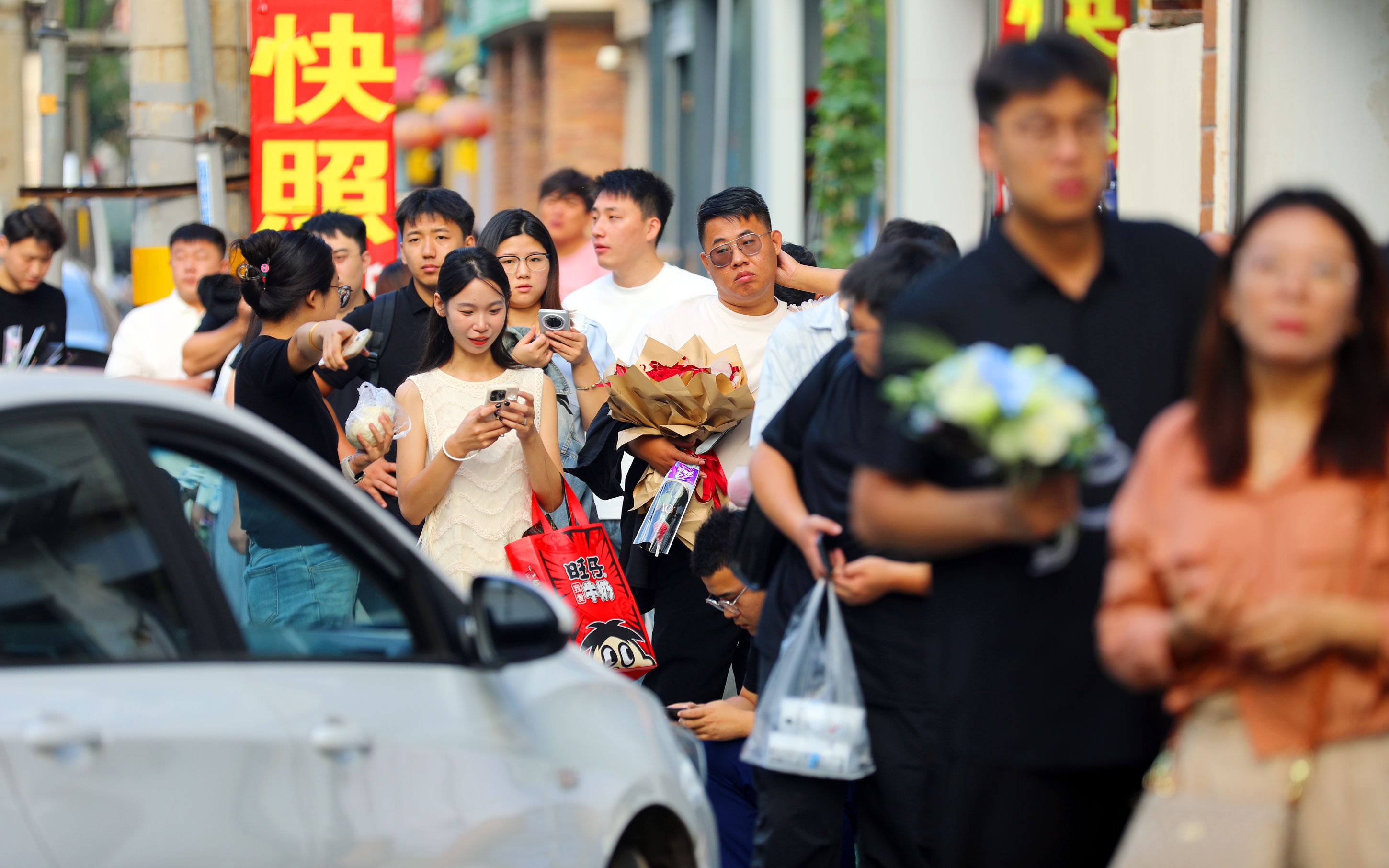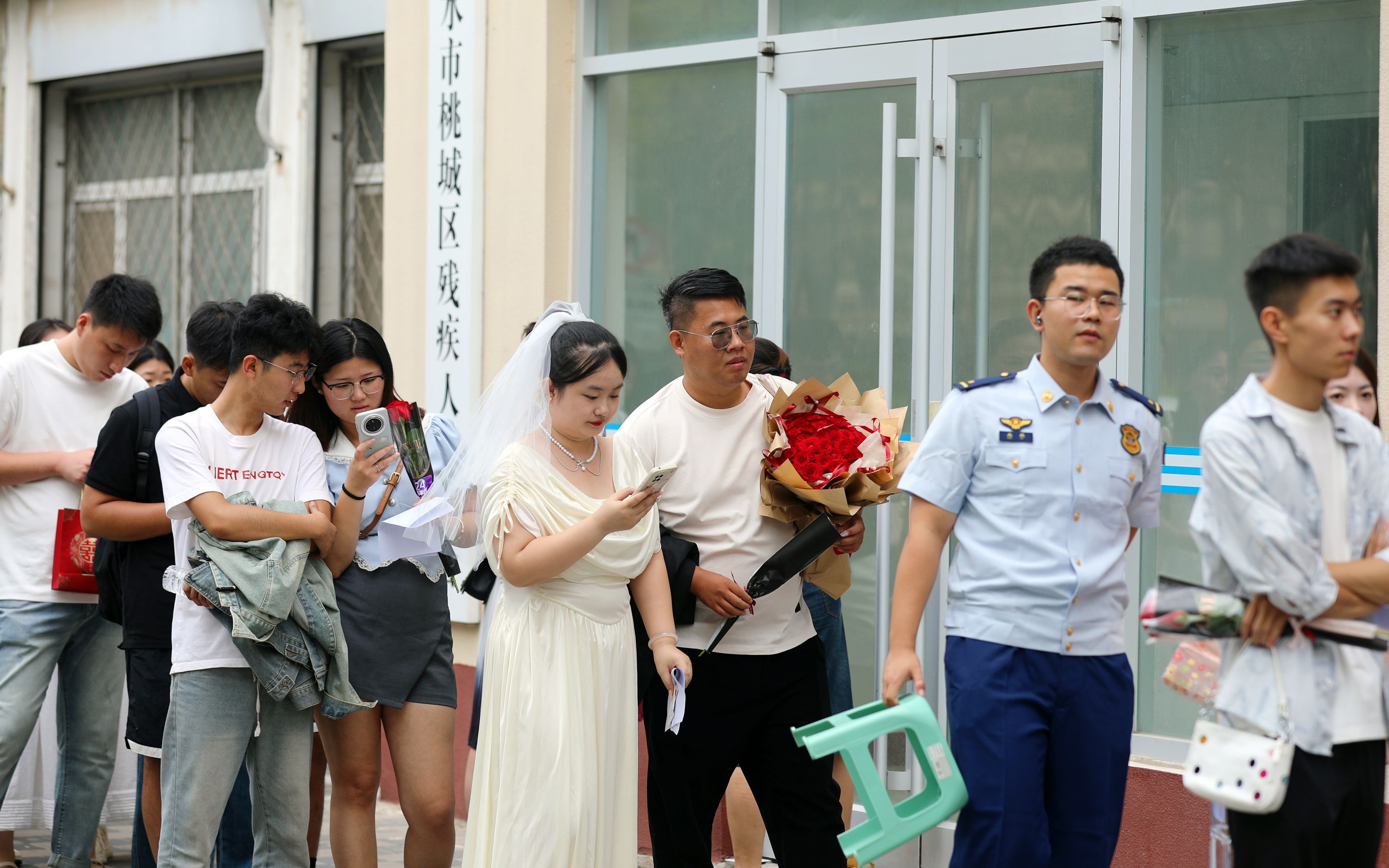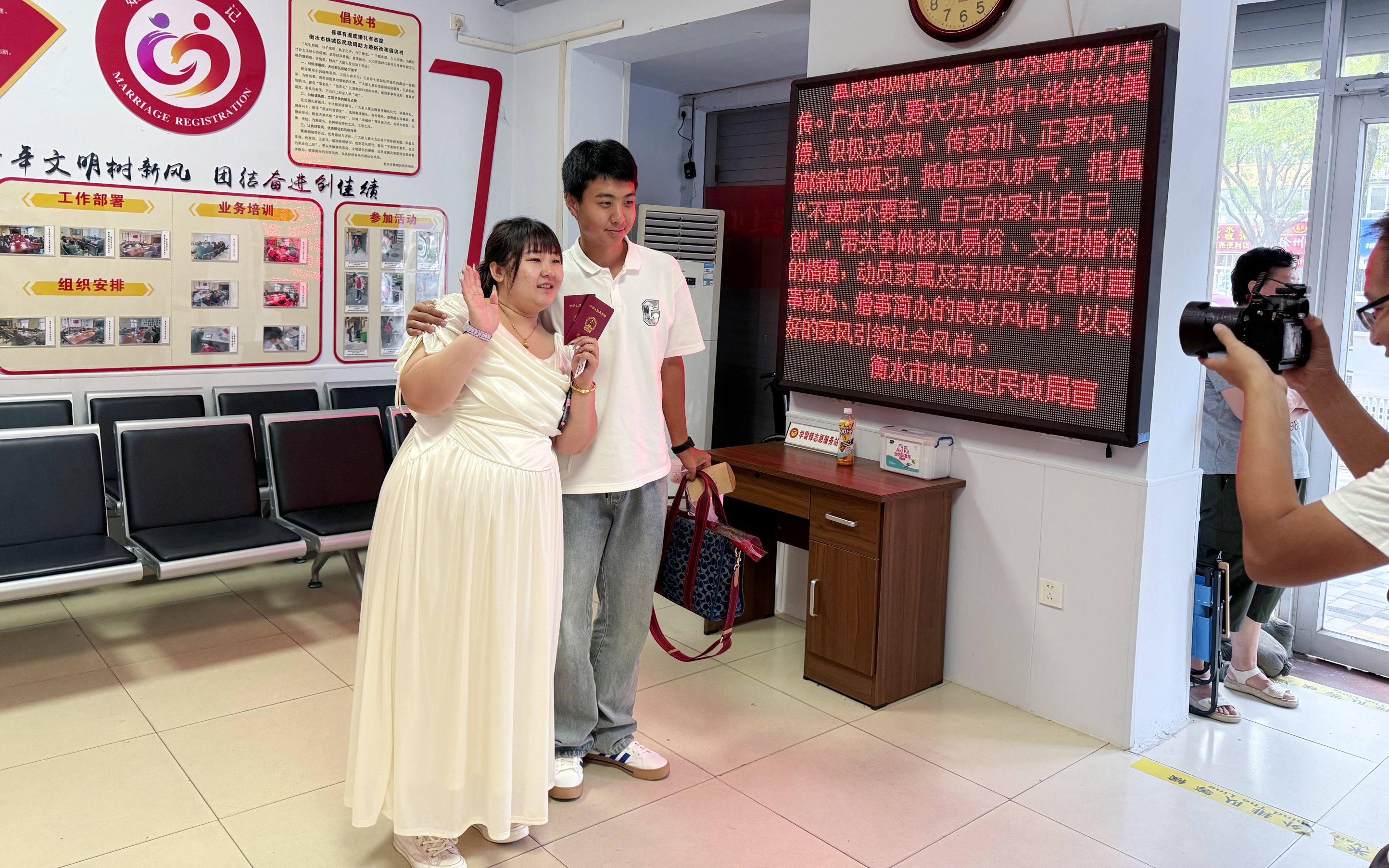 当日清晨6时许,桃城区民政局婚姻登记处门前已排起长队。排在队伍首位的王先生手捧一束带着晨露的红玫瑰,正温柔地为女友梳理额前发丝。“我们凌晨4点就来排队了,就想在七夕这个有特殊纪念意义的日子里,早点拿到结婚证。”王先生紧握女友的手说道。