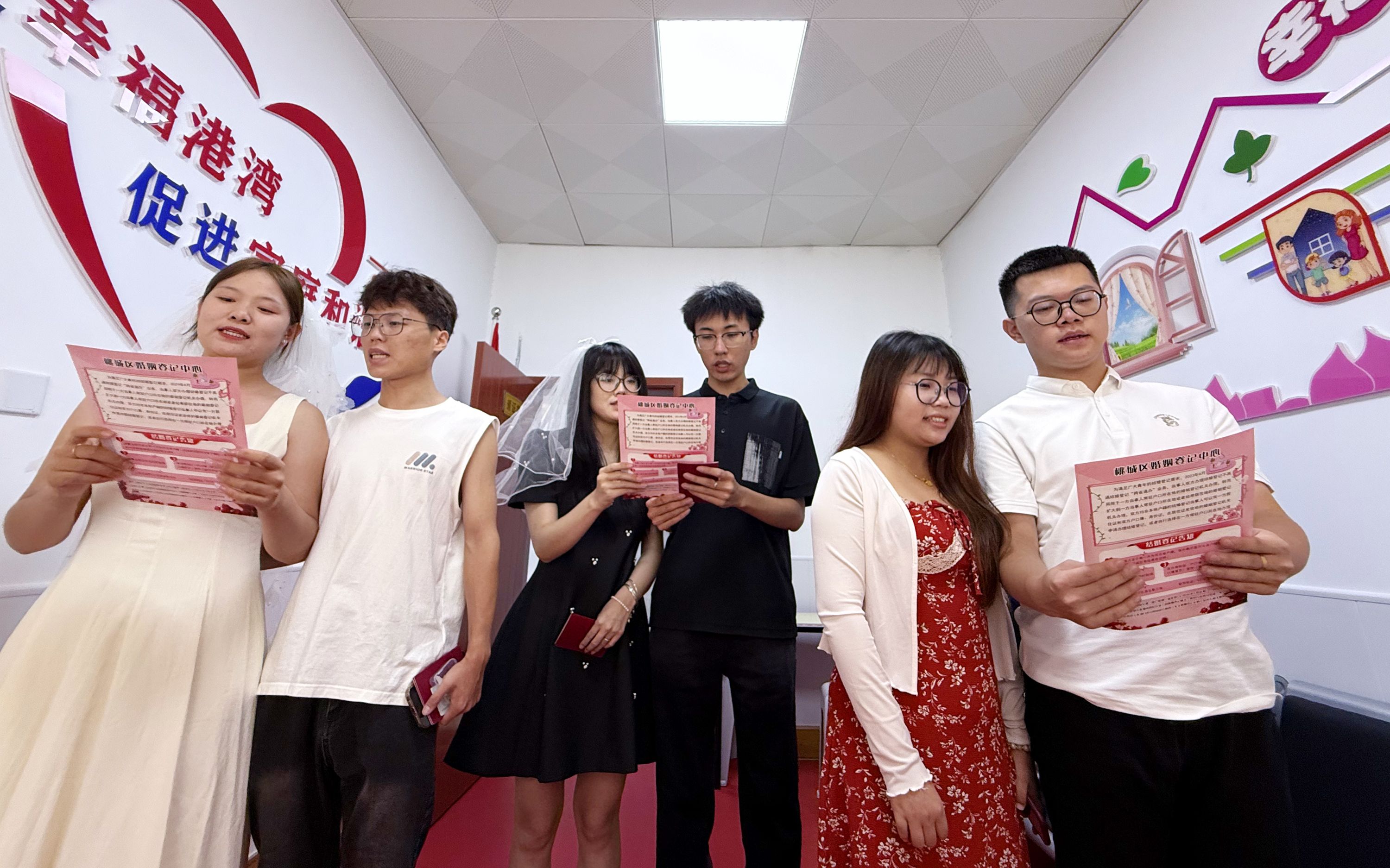 上午7时30分,婚姻登记处提前开放服务。在志愿者的引导下,新人们分批次有序进入登记大厅。服务窗口前,工作人员一边耐心指导新人填写婚姻登记表格,一边细致核对身份证、户口簿等证件信息,确保每份登记材料准确无误。完成材料核验后,工作人员为新人们正式颁发结婚证,并与新人一同宣读结婚誓言,见证这一重要时刻。
