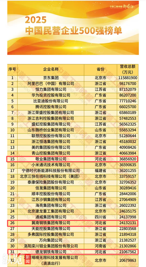 纵览客户端讯(记者卢伟丽 见习记者刘世鹏)8月27日,全国工商联发布“2025中国民营企业500强”榜单,河北省共有32家企业上榜,进入前50名的有6家。