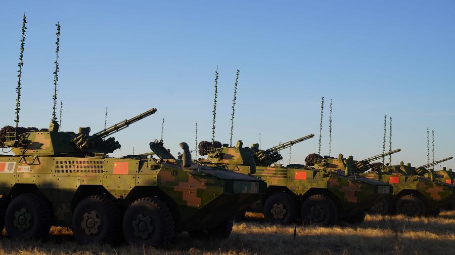 2021年9月20日,在俄罗斯奥伦堡州东古兹靶场举行的“和平使命-2021”上海合作组织联合反恐军事演习开幕式上,中方参演部队接受检阅。新华社记者梅世雄摄