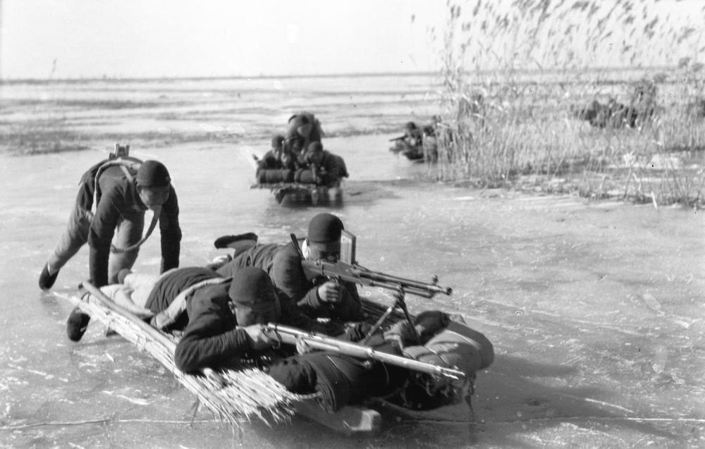 20世纪40年代,雁翎队在冰雪中练兵。新华社发(资料图片)