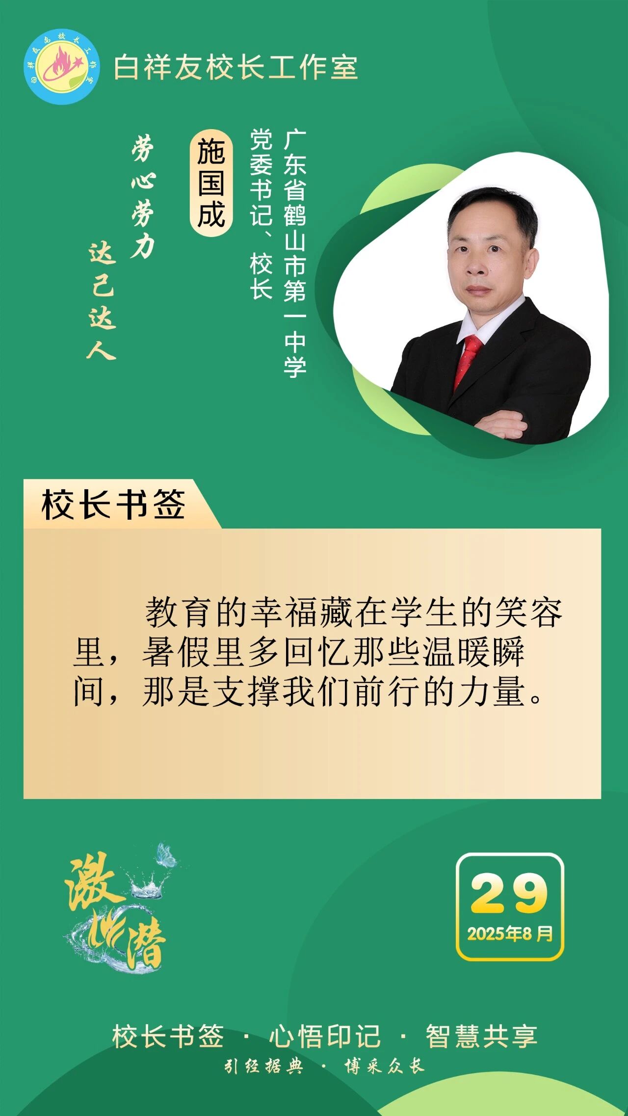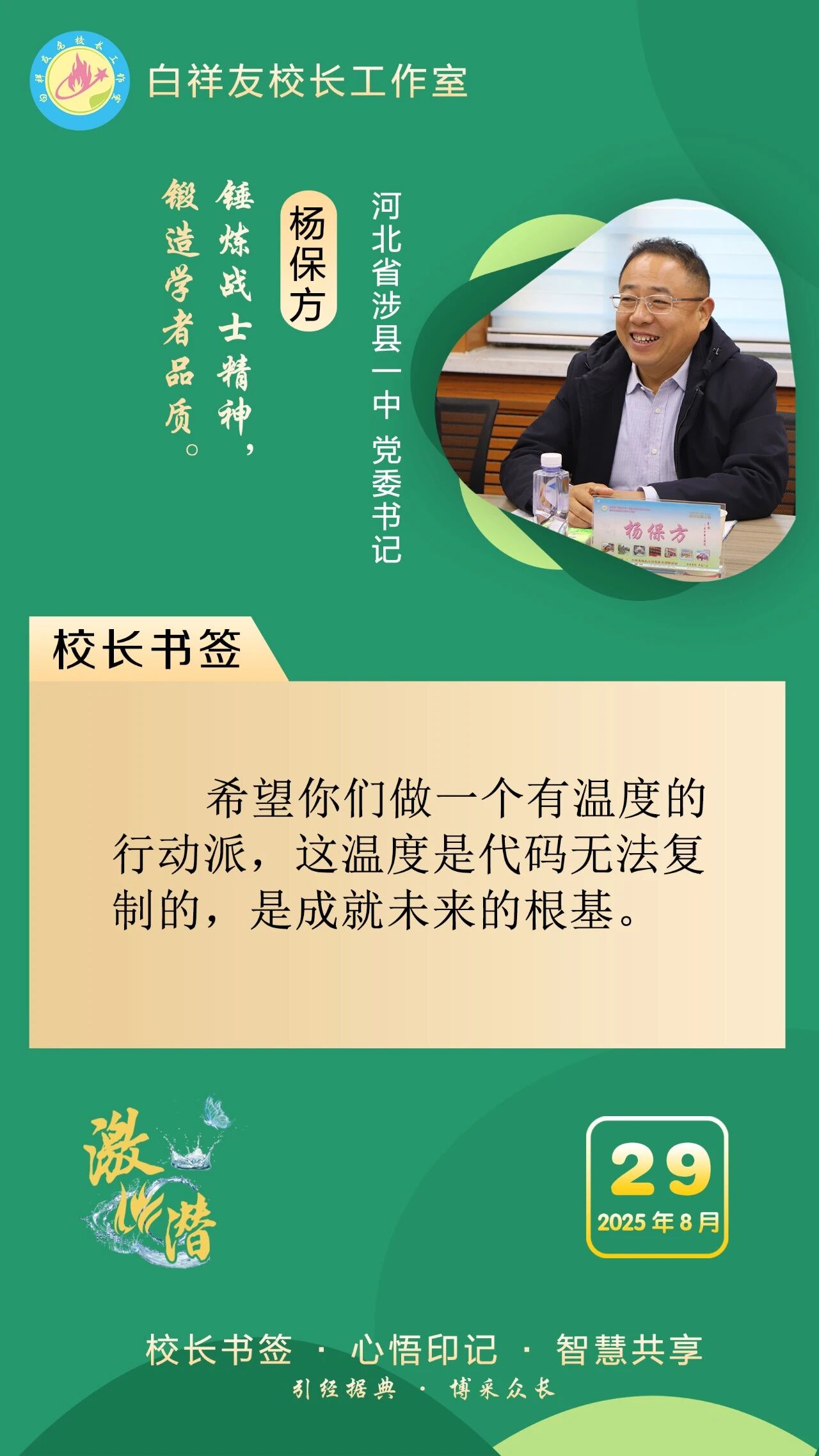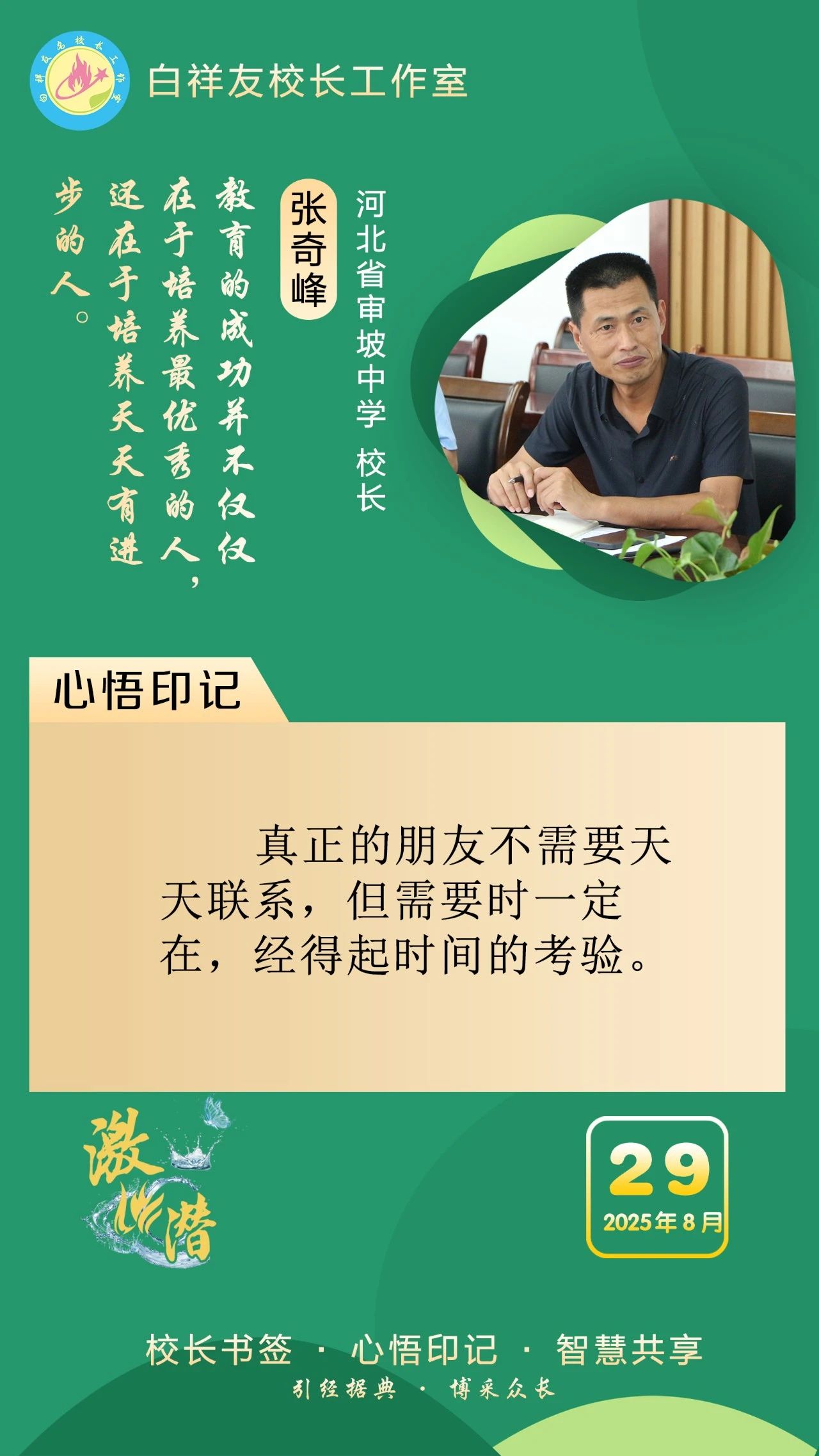 “白祥友校长工作室”成立于2019年4月,是教育部“国培计划”中小学名校长领航工程、河北省首批名校长工作室,目前省内外成员校59所。工作室坚持“资源共享、智慧共融、互助共赢”理念,已成为思想碰撞的交流场,资源共享的品牌站,成果展示的辐射源。