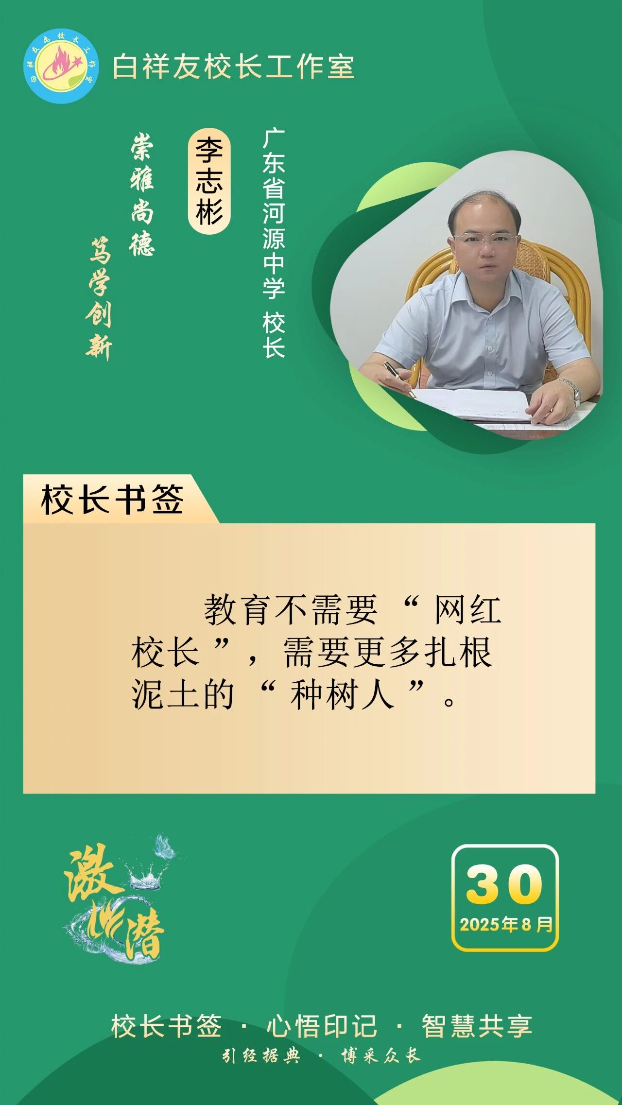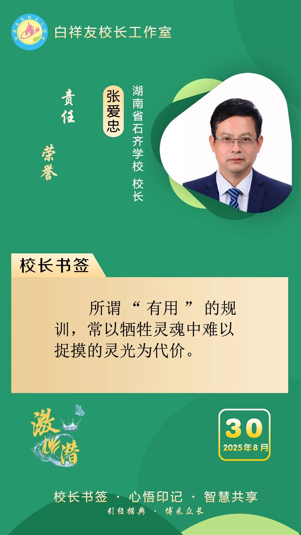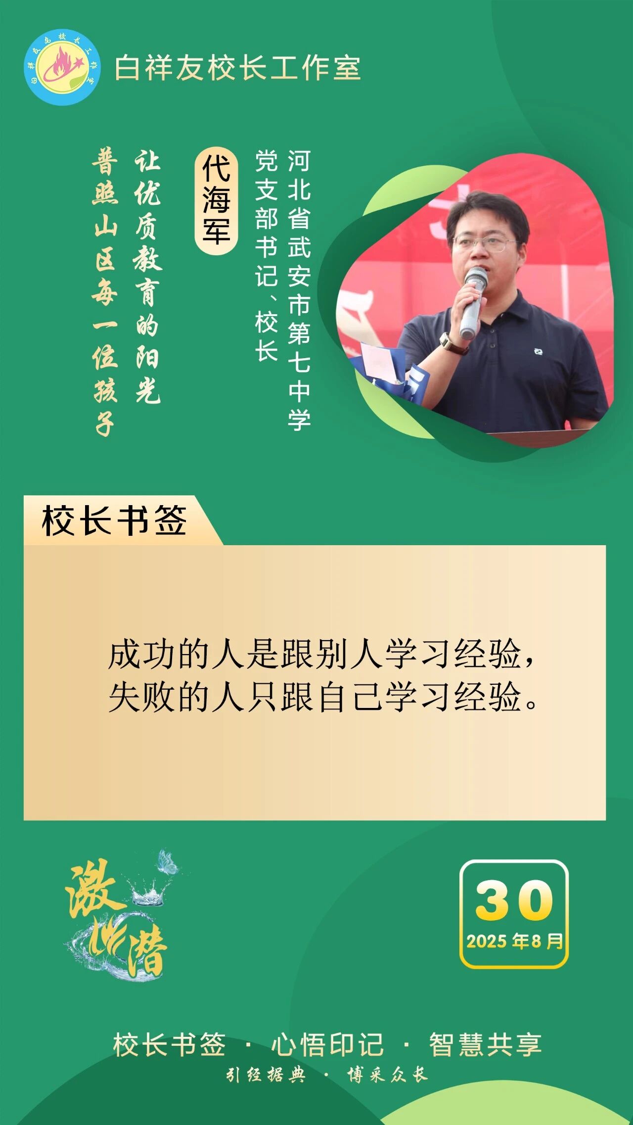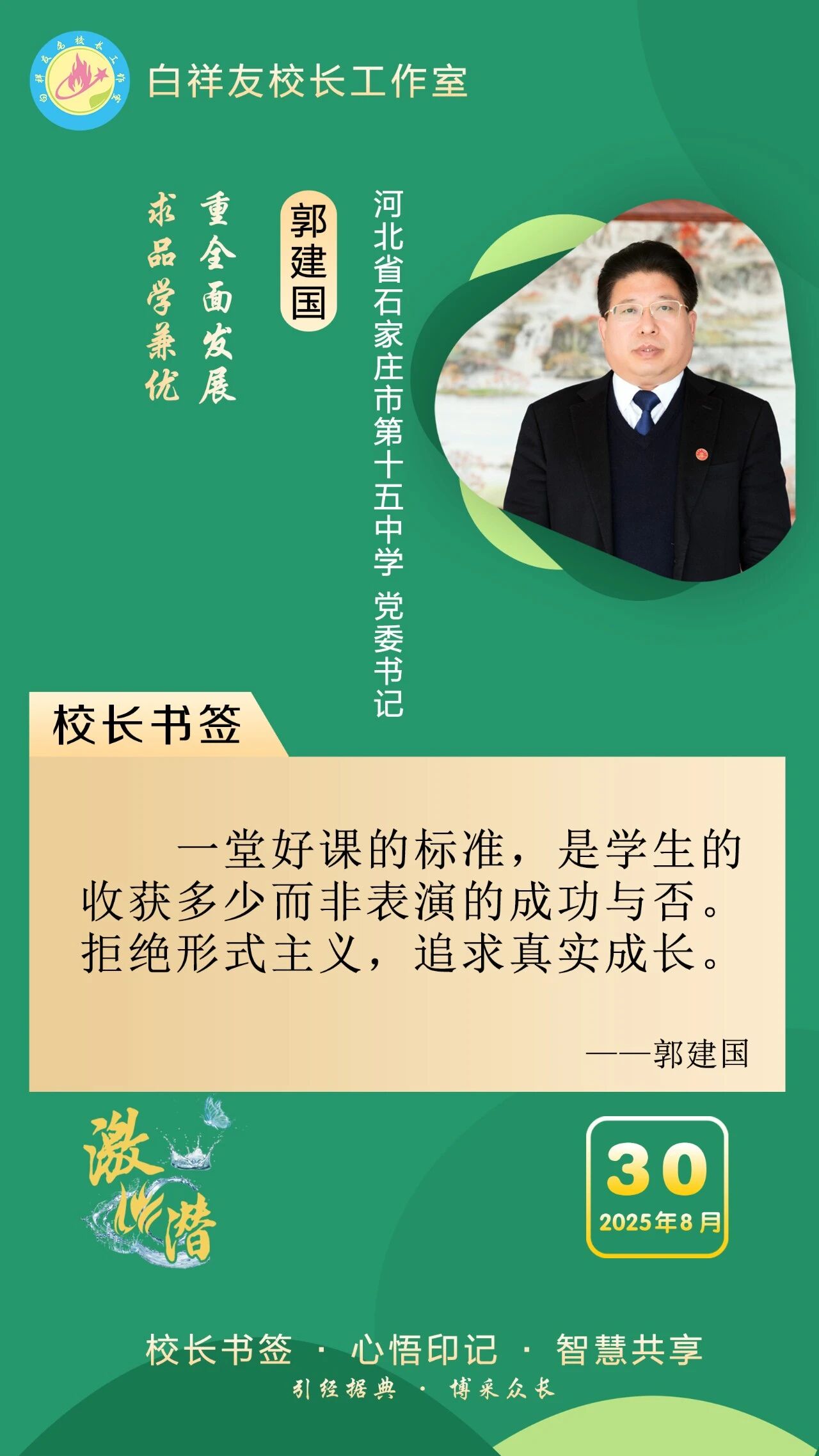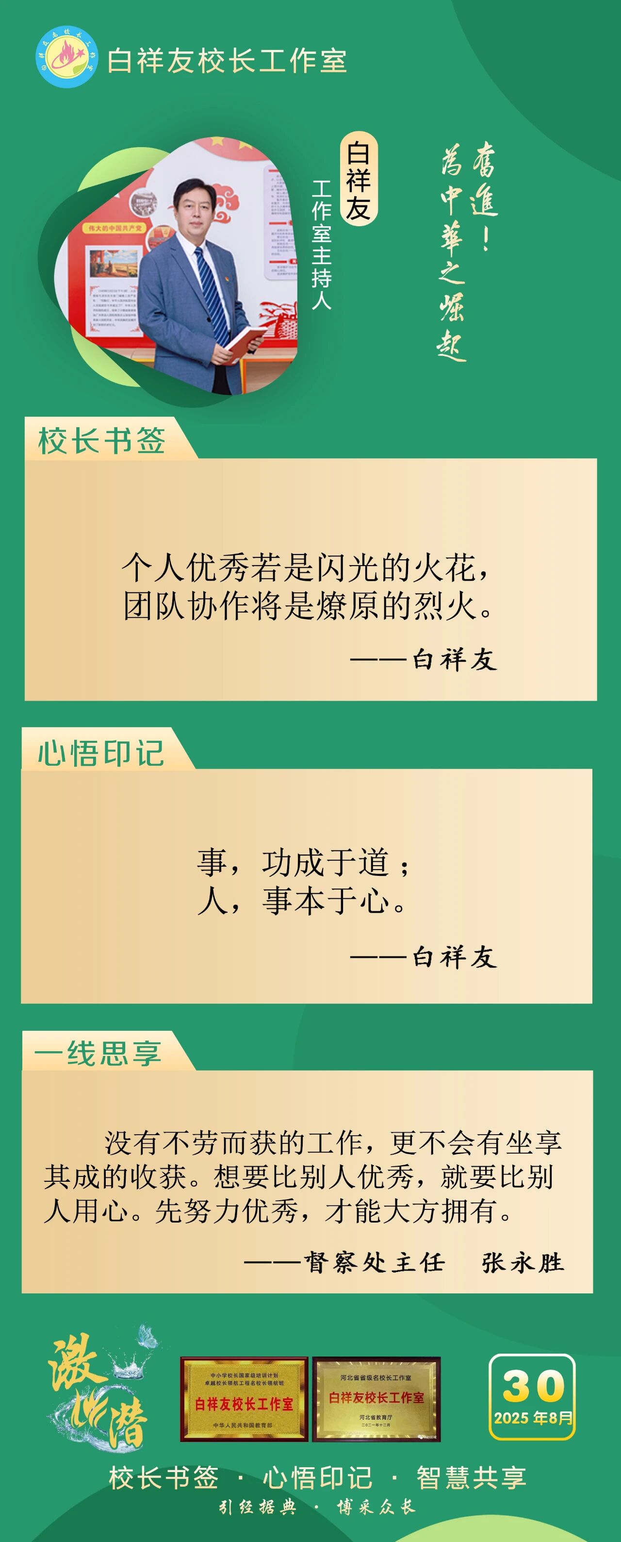 “白祥友校长工作室”成立于2019年4月,是教育部“国培计划”中小学名校长领航工程、河北省首批名校长工作室,目前省内外成员校59所。工作室坚持“资源共享、智慧共融、互助共赢”理念,已成为思想碰撞的交流场,资源共享的品牌站,成果展示的辐射源。 点赞 +1 微博 微信 我要评论 发布 相关推荐 巾帼筑梦绽芳华 向光而行建新功 河北衡水中学举办第十八届“杰出女教师”表彰大会 资讯速递 4天前 衡水十三中学子这样追“锋”! 教育大观 03-06 马力加载,衡水十三中学子元气回归! 教育大观 03-05 青春不 “宅” 家!跟着衡水十三中学子“趣”过寒假 教育大观 03-02 看衡水十三中学习的新年全家福 教育大观 02-27 “新春氛围组”就位,看衡水十三中学子解锁红火中国年! 教育大观 02-24 激潜铸魂践初心 奋进逐梦启新程————衡水市第十三中学2025年办学成果回眸 教育大观 02-11 字里行间藏着最动人的成长——衡水十三中学子走进特教学校 教育大观 02-05 热门 一天 三天 一周 1 把“最活跃地带”打造成“最坚强阵地” 衡水以三大抓手破题新就业群体党建 2 为思想“充电” 为幸福“加油” 武邑县总工会举办女职工主题讲座 3 衡水市环卫中心开展便道冲洗专项行动 为城市环境“洗颜换妆” 4 今年衡水将完成200户特殊困难老年人家庭适老化改造 5 衡水发布2月份食品安全“红黑榜” 194家生产经营主体上榜 6 枣强:植绿护绿正当时 多彩活动共筑生态家园 7 两会快评 | “代表刚回房间,答复马上就到”何以引发共鸣? 8 衡水阜城:春回大地农事忙 9 吹拉弹唱 读书看报 武邑农家书屋成了村民“开心场” 10 田间“取经”+云端“把脉” 衡水供销系统农服研讨会“解渴”又“管用” 1 守护安全 畅通消费 衡水市2026年“3·15国际消费者权益日”系列活动启动 2 人勤春来早 春管正当时——衡水市扎实推进春季农业生产纪实 3 【新闻发布】衡水发布2025年消费维权“成绩单”——12315热线受理投诉按时办结率100% 4 衡水全力加强麦田春管夯实夏粮丰收基础 5 衡水市工商业联合会(总商会)第七次代表大会召开 6 【新闻发布】每人每月最高800元 衡水向中度以上失能老年人发放养老服务消费补贴 7 【乡村行 看振兴】棚室轮作种植 果蔬四季“生金” ——看董师傅如何算好“增收账” 8 气温回暖年货干果易霉变 衡水市人民医院消化内科医生提醒:出现这三种情况切勿食用 9 武强县开展“3・15”金融消费者权益保护宣传活动 10 河北衡水:湖城春景入画来 1 《中华人民共和国献血法》首次修订——这些变化和每位献血者有关 2 春回大地寻野趣!衡水市民踏青挖野菜 安全尝鲜需谨记 3 景县举办庆“三八”国际妇女节文艺汇演 4 衡水籍运动员刘晓彬米兰冬残奥会上夺银 5 “巾帼芳华 为爱赴约” 衡水市总工会举办青年职工相亲交友活动 6 国防教育进校园 点燃青春报国志 我市军事机关送课下基层活动在衡水二中启动 7 首金诞生!衡水健儿省运会冰雪赛场勇创佳绩 8 一场制造业的“数字春雨”——衡水市景县优化营商环境一线探访 9 春风送岗暖民心 衡水故城县举办残疾人专场招聘会 10 书香润初心 玫瑰绽芳华 市总工会举办主题读书分享会 广告 广告 广告 24小时 1 习近平的两会时间丨开局 2 习近平主席复信为中法、中欧友好汇聚青春力量 3 当“超级充电宝”装上“智慧大脑”——河北武强鸿布储能电站探访 4 武强县吹响春管“冲锋号”力保夏粮丰收 5 衡水农商银行开展消保驿站金融知识宣传教育活动 6 建行衡水分行举办妇女节系列主题活动 7 2026年储蓄国债首发日 衡水实现“开门红” 8 一块酥糖 四代人的“甜蜜”守护——记支恒良酥糖制作技艺传承人支欣来 9 提升消费品质|衡水移动多维度开展“3·15”主题系列活动 10 海报系列||早安衡水