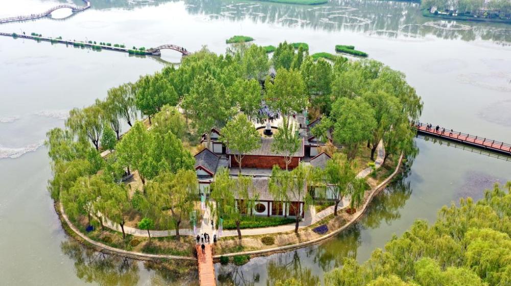 坐落于白洋淀荷花大观园的荷花淀派文学馆(无人机照片)。新华社发