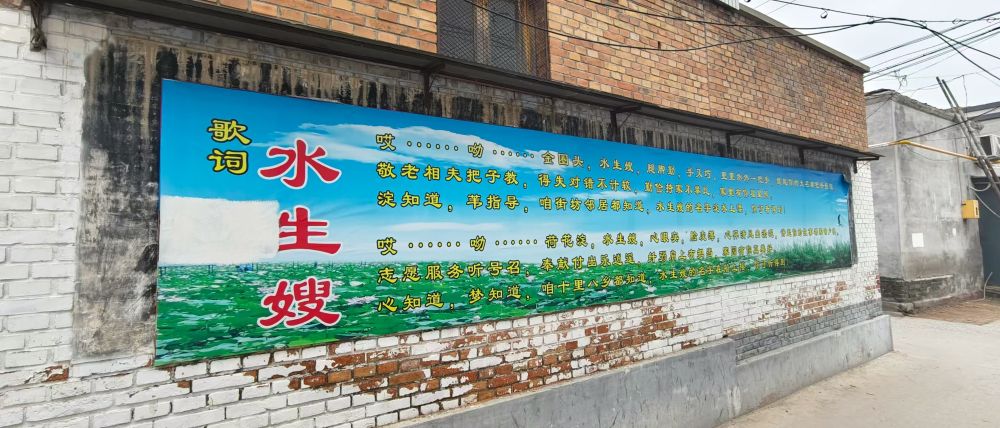 在安新县圈头乡西街村的一面墙上,喷涂着歌曲《水生嫂》的歌词。新华社记者 苏凯洋 摄