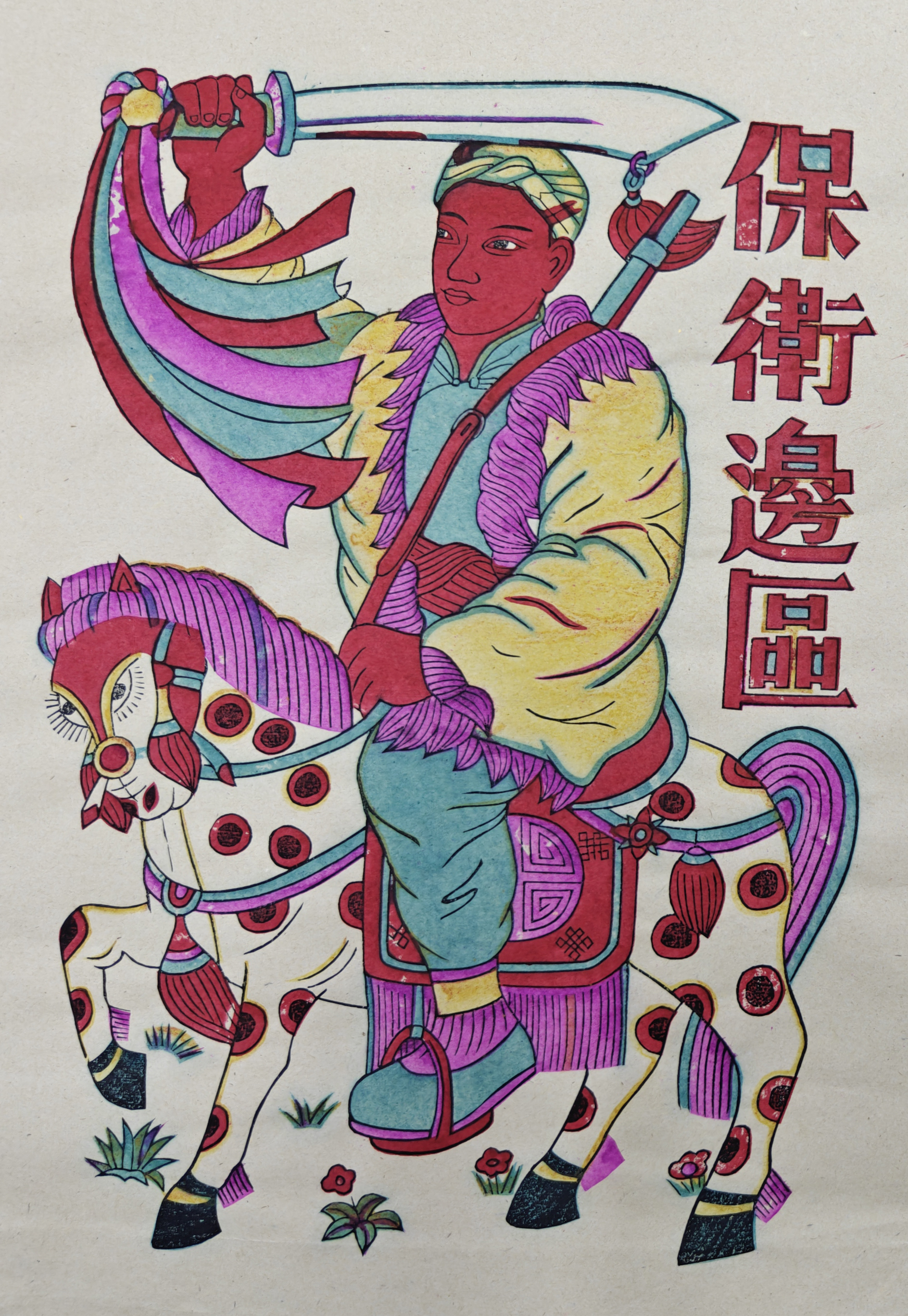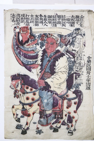 在武强年画博物馆的革命年画展区,一幅幅创作于抗日战争时期的年画作品静静陈列。不同于普通年画驱凶辟邪、祈福纳祥的主题,这些作品在创作上将保家卫国的情怀融入其中,形成了新的年画品类——抗战年画。展示区里,一幅《打日本救中国》门神年画引人注目。这幅年画以传统骑马门神形象为基础,旁边印着“打日本救中国”六字标语,画上的门神怒目圆睁、手持兵器,威武而有震慑力。尽管时代变迁,如今站在这幅年画前,依然可以让人一眼望去血脉偾张。