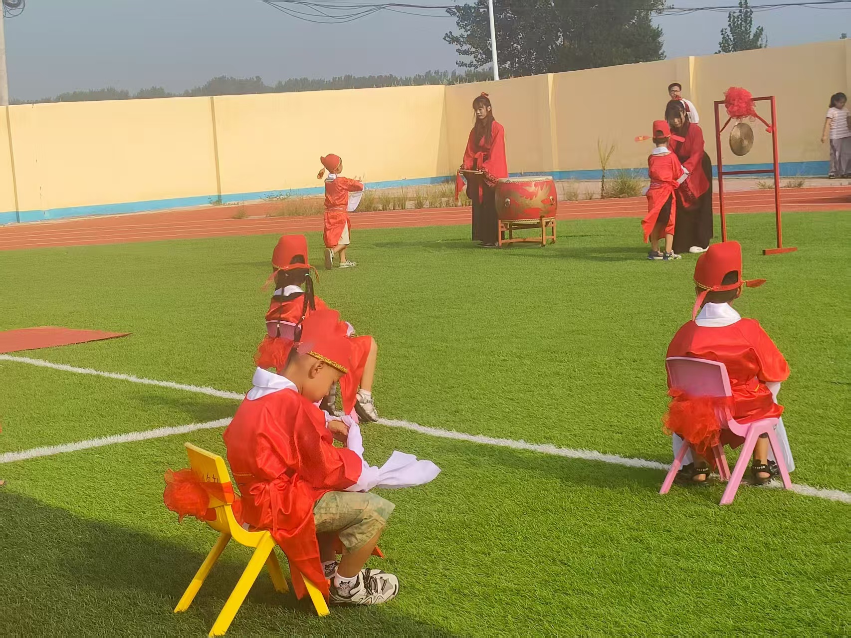 活动在欢快的锣鼓声中拉开序幕。上百个身着红色状元服的孩子,排着整齐的队伍依次上前,郑重地击响状元鼓、敲响状元锣。随后,老师在每个孩子的额头中间点上朱砂痣,寓意开启智慧。