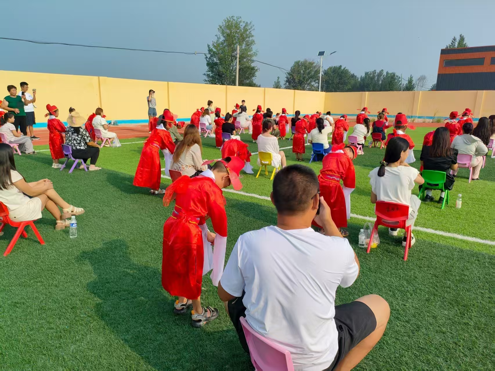 感恩礼的拥抱环节成为全场最温暖的瞬间。当主持人轻声说出“请家长和孩子拥抱彼此”时,原本热闹的操场瞬间安静下来。孩子们与家长紧紧相拥,不少家长感动得热泪盈眶。紧接着,家长们为孩子正衣冠,细心地整理衣领、捋顺头发、拉平衣角,再为他们系上鲜艳的大红花。随后,孩子们向父母行跪拜礼,以此感谢父母的养育之恩。5岁的张子涵抱着妈妈说:“妈妈,你每天送我上学,辛苦啦。”简单的话语让家长觉得所有的付出都值得了。