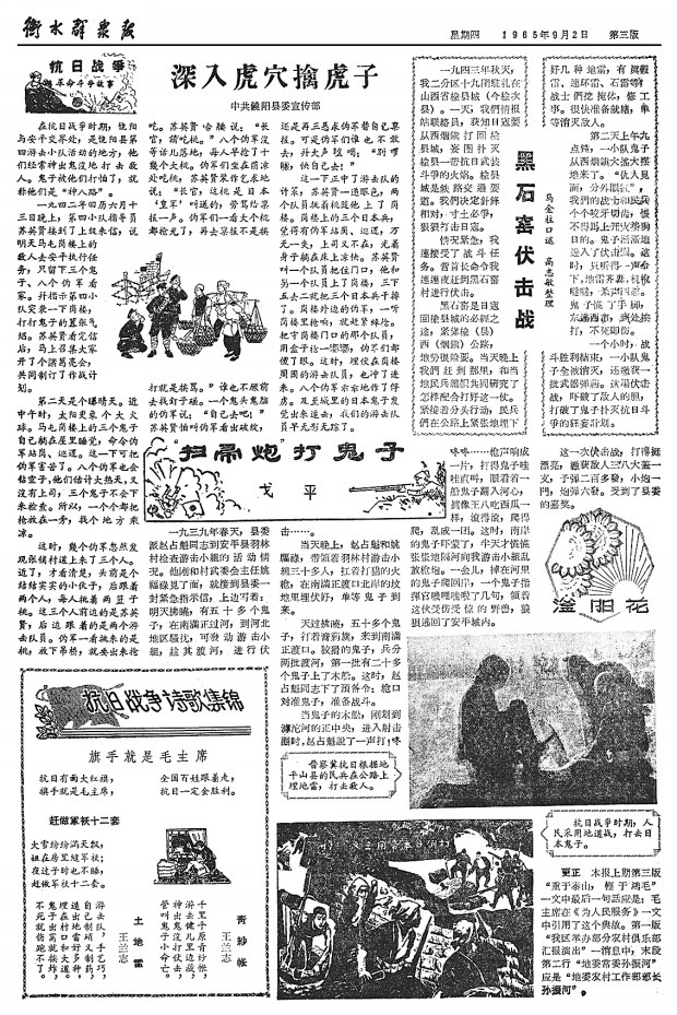 《衡水日报》1971年9月21日3版刊发《土地雷痛击鬼子兵》。深县寺头村的民兵爆炸组曾活跃在日本鬼子的交通要道——深安公路上。他们用土办法制成了扫帚雷、拉火雷、踩火雷等多种土地雷,配合主力部队,打得敌人狼狈不堪。此外,衡水各地的敌后武装工作队巧妙地突破日军封锁,进行锄奸反特斗争,开展“上夜课”、记“黑红点”等工作,分化瓦解伪军。