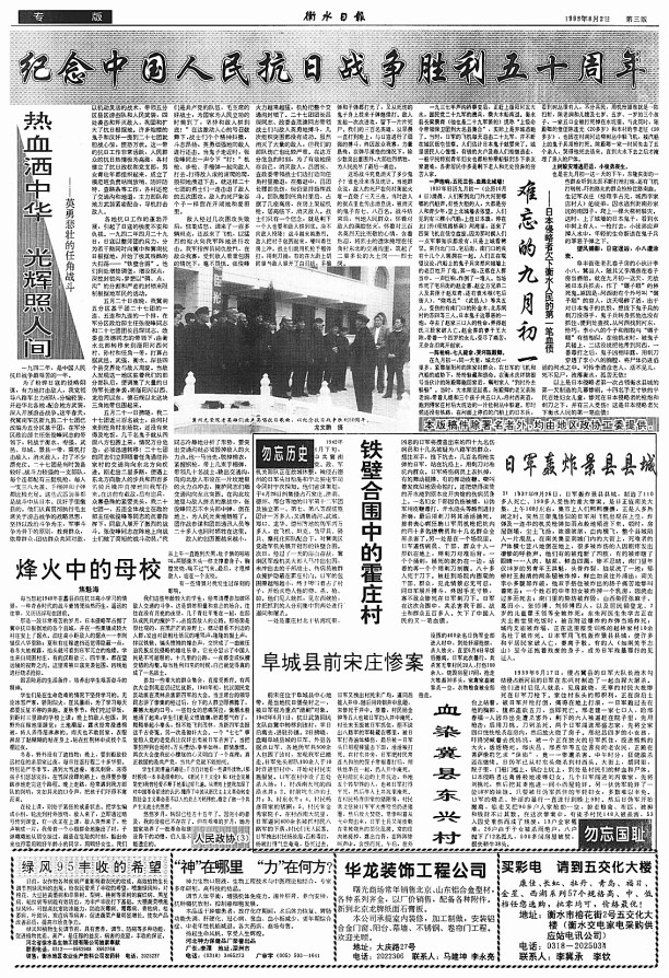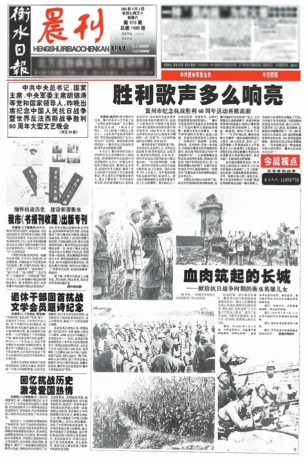 抗日战争期间,衡水大地燃起了烽烟战火。回顾数十年来我们的报纸中的相关报道,描绘“战争画卷”“英雄图谱”——当年衡水军民在中国共产党的领导下建立抗日根据地,拿起简陋的武器,在田间沟壑、青纱帐中与日寇展开了艰苦卓绝的斗争,无数英烈付出鲜血和生命,最终取得胜利。岁月荏苒,伟大抗战精神永远照亮我们的前行之路!