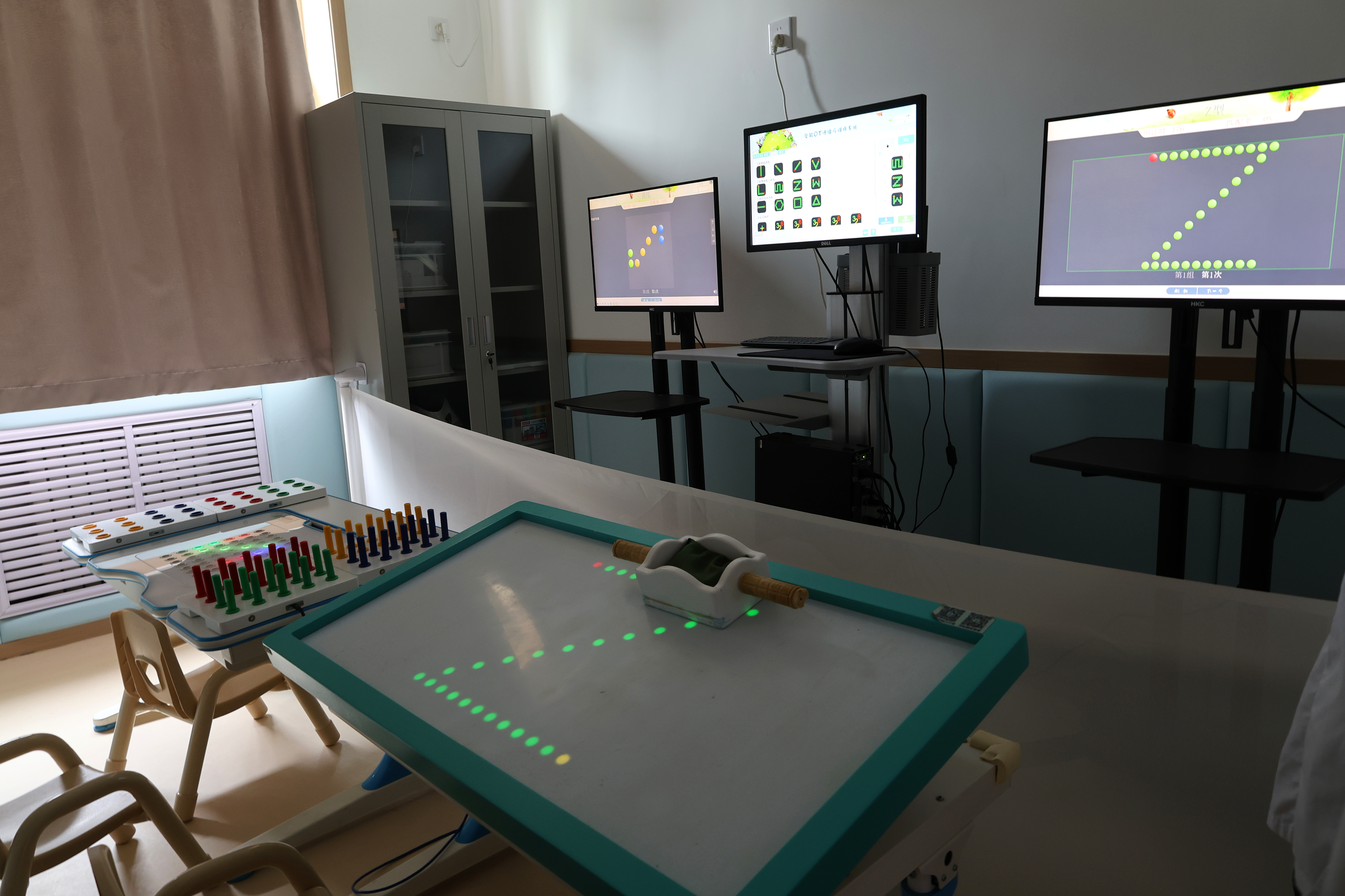 在托育中心康复训练室,科技与传统温柔碰撞:可视音乐治疗中,光影随旋律流转,帮助自闭症儿童缓解情绪;智能OT系统通过游戏化训练,精准提升孩子的手部精细动作;中医康复区里,艾灸的温煦与推拿的力道结合,为特殊儿童筑起健康屏障。所有康复训练都藏在游戏里:爬彩虹隧道是在练平衡,给毛绒玩具喂饭是在做手部功能训练,就连户外乐园的跷跷板,都被康复师赋予了“锻炼核心肌群”的专业意义。