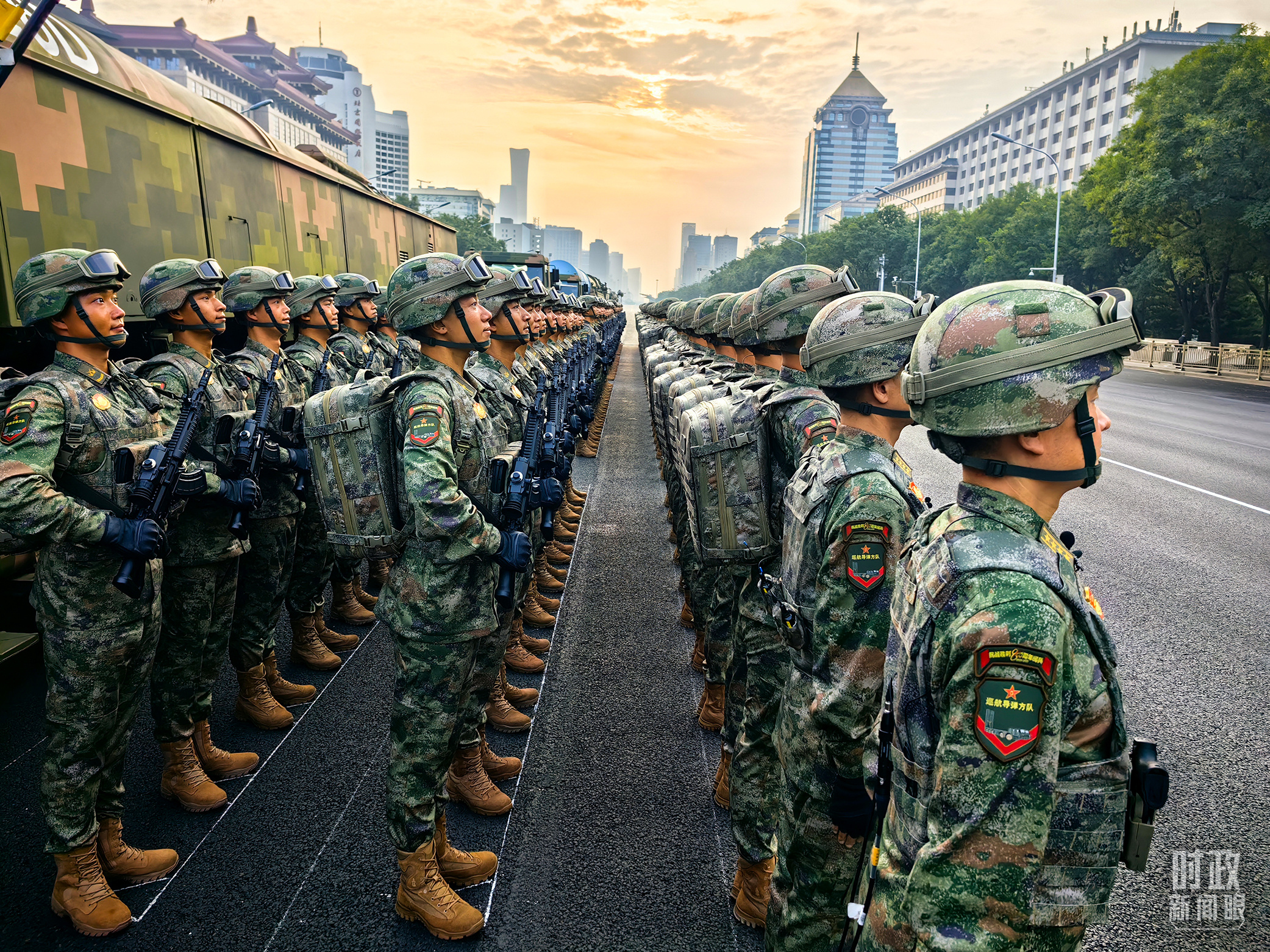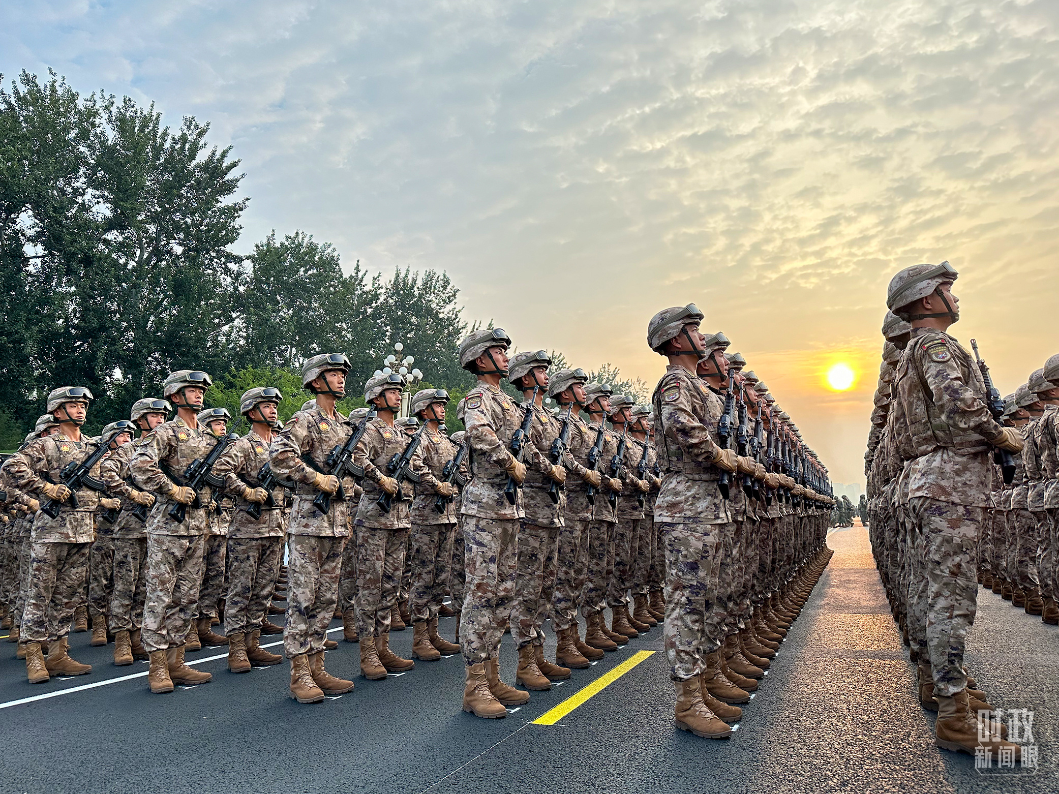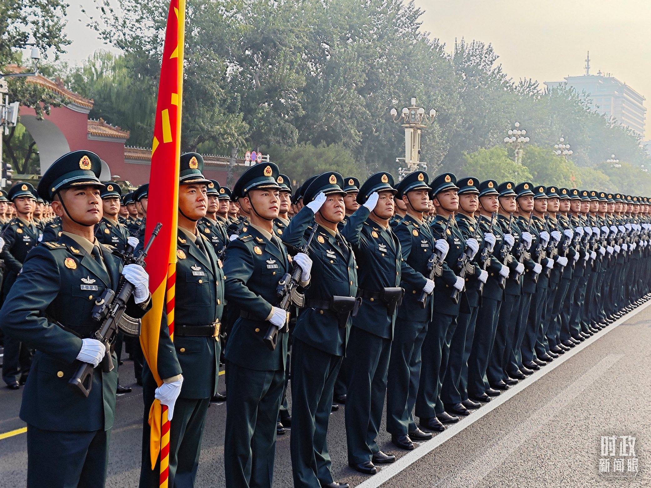 9月3日上午,红日东升,霞光洒满北京长安街,45个受阅方(梯)队整齐列队。天安门广场上旌旗猎猎,气象恢宏。