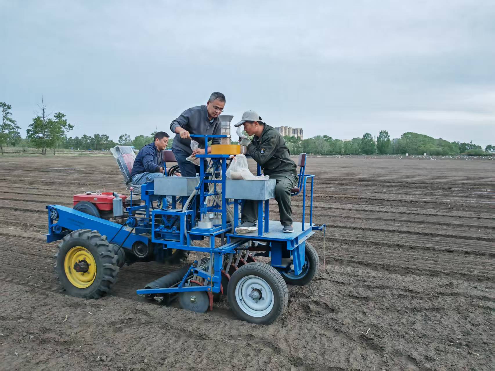 图片说明:燕麦育种团队采用小区播种机进行小区试验播种