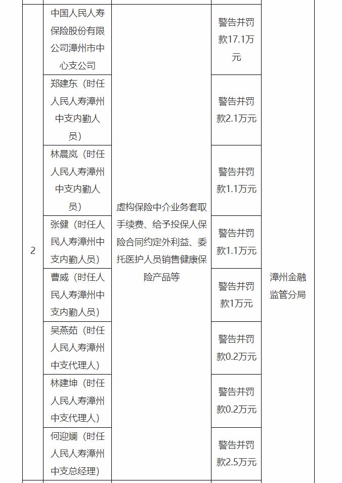 张健,时任人民人寿漳州中支内勤人员,被漳州金融监管分局警告并罚款 1.1 万元;