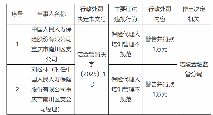 此外,中国人民人寿保险股份有限公司重庆市南川区支公司,依据涪金管罚决字〔2025〕1 号文件,因其保险代理人培训管理不规范,被涪陵金融监管分局警告并罚款 1 万元。