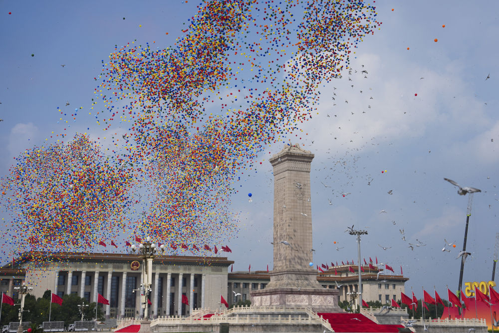 2025年9月3日,纪念中国人民抗日战争暨世界反法西斯战争胜利80周年大会在北京隆重举行。这是纪念大会现场放飞气球和鸽子。新华社记者 牟宇 摄