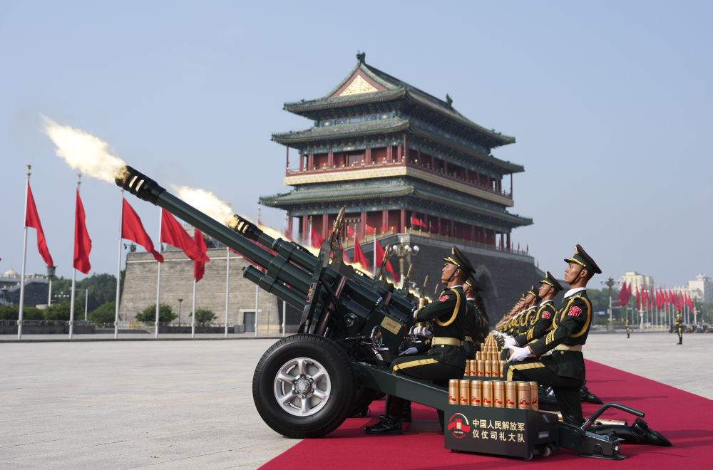 2025年9月3日,纪念中国人民抗日战争暨世界反法西斯战争胜利80周年大会在北京隆重举行。这是礼炮在天安门广场鸣响。新华社记者 牟宇 摄