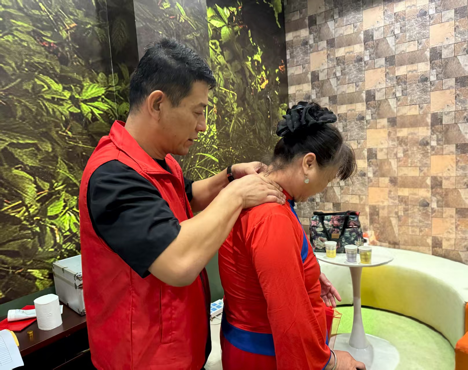 开放当天,按摩室内暖意融融。志愿者耐心询问居民身体状况,提供针对性服务。为肩颈疼痛的居民马庆稳进行穴位按摩和热敷理疗,为长期腰痛、站立困难的付荣菊开展脉冲经络疏通与精油活血,还传授日常护腰、护颈小技巧。刚体验完服务的马庆稳称赞道:“以前肩颈疼得抬胳膊都费劲,去医院排队不方便,现在在家门口就能免费享受专业按摩,太贴心了!”