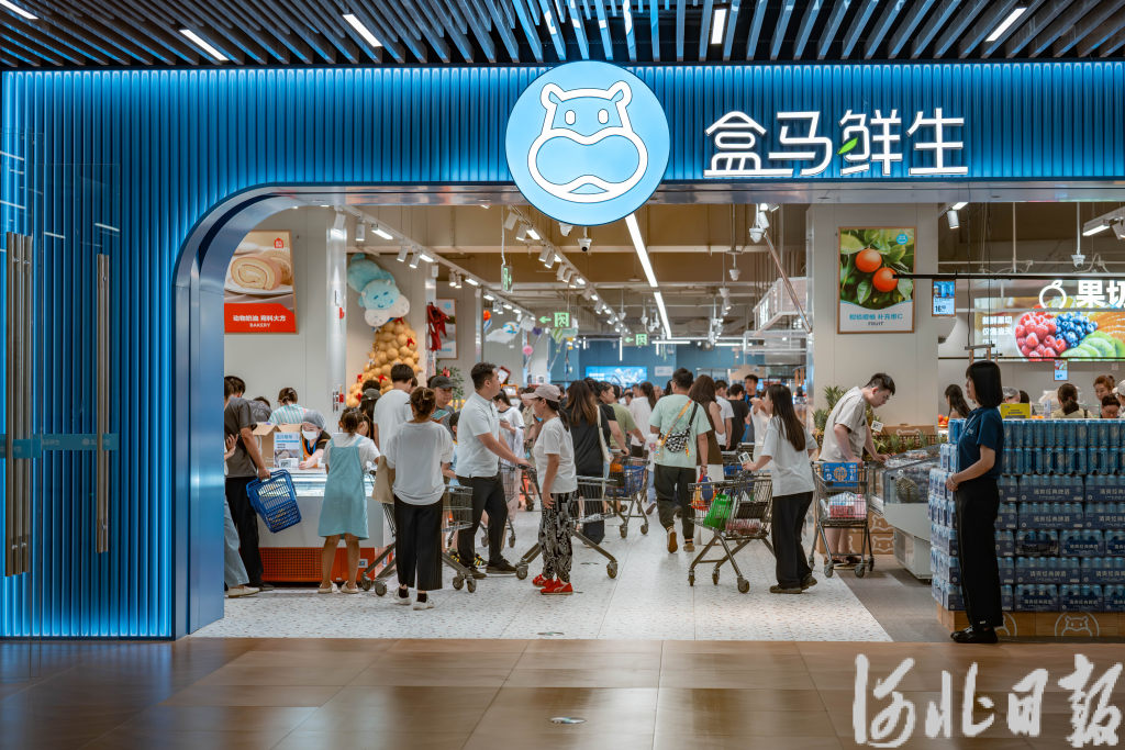 近日,唐山市路北区爱琴海购物中心,市民在河北首家盒马鲜生选购商品。