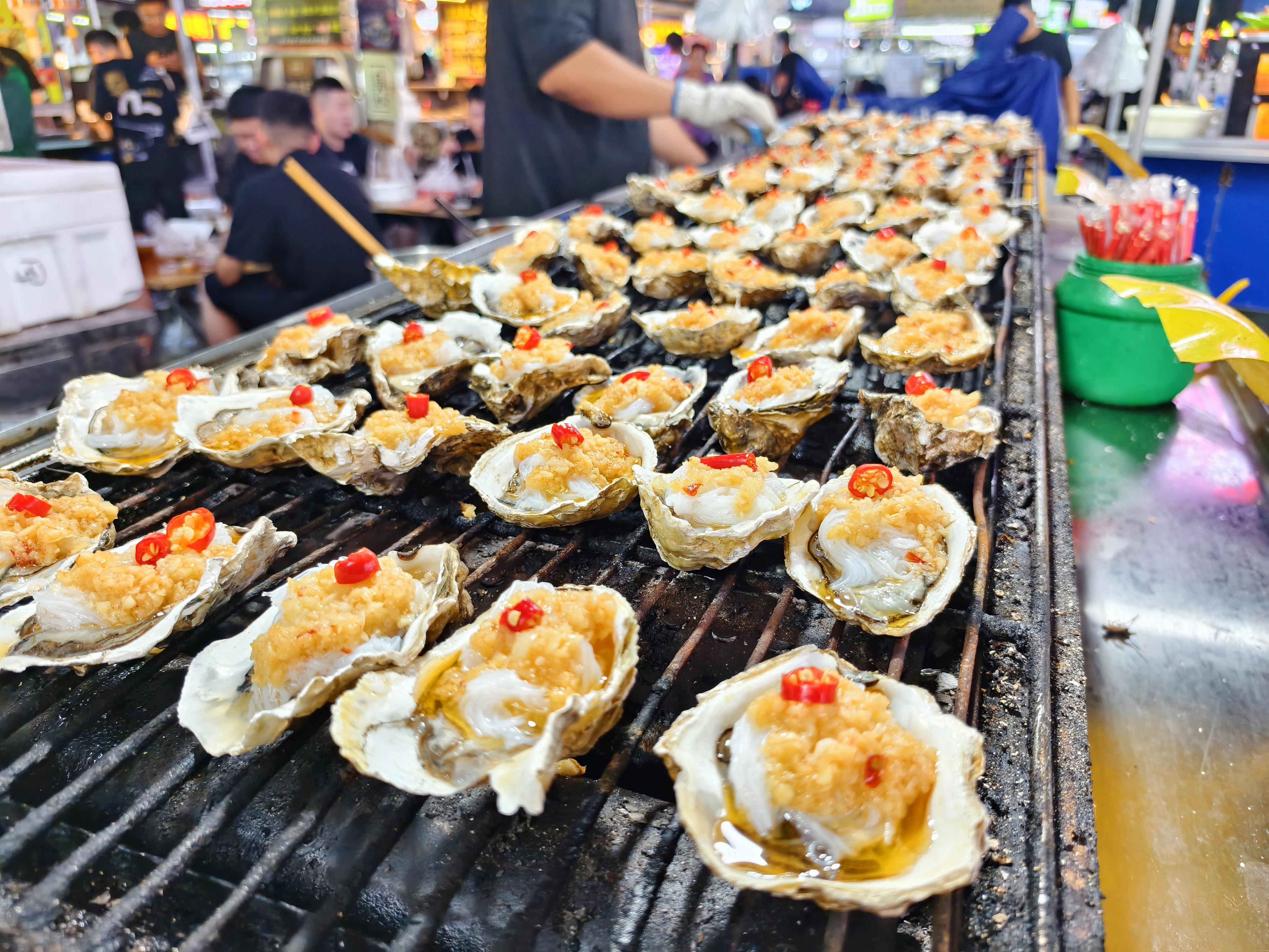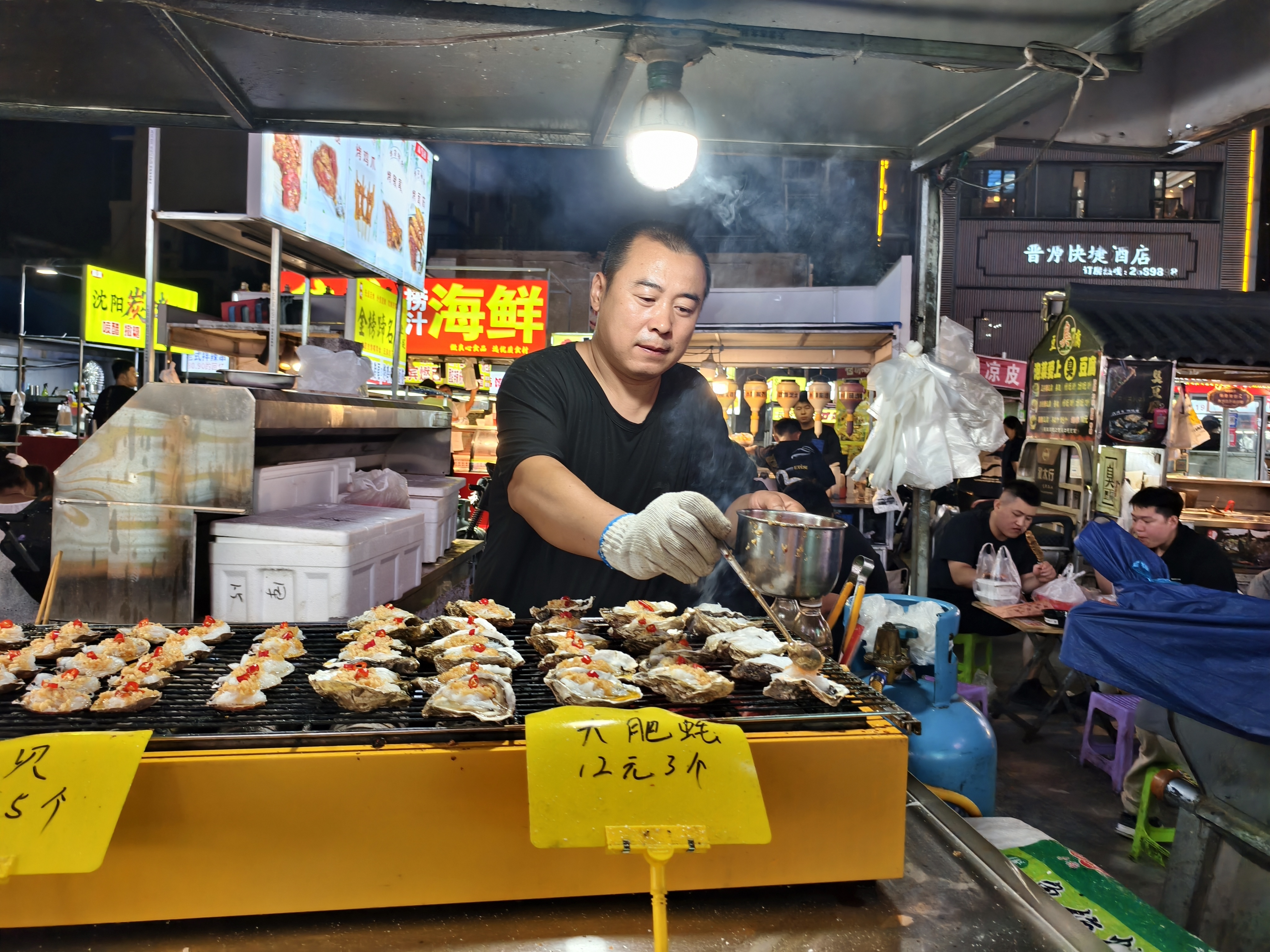 穿行于夜市之中,琳琅满目的美食摊位依次排开。烤架上的鸡腿和肉串滋滋作响,油光闪动,腾起的烟雾里,摊主手法熟练地翻动、刷酱,诱人的香气不断飘散。卖烤生蚝的摊主戴着白手套,仔细地为每一只生蚝浇上蒜蓉和油,油滴落至炭火时蹿起的火苗,仿佛也为夜色添了几分生动。“我烤生蚝八年了,每天营业到早晨五六点,能卖出三百个左右。”摊主一边忙活一边介绍。他身后的简易餐桌早已坐满,大家边吃边聊,暂时放下了白天的忙碌与疲惫。