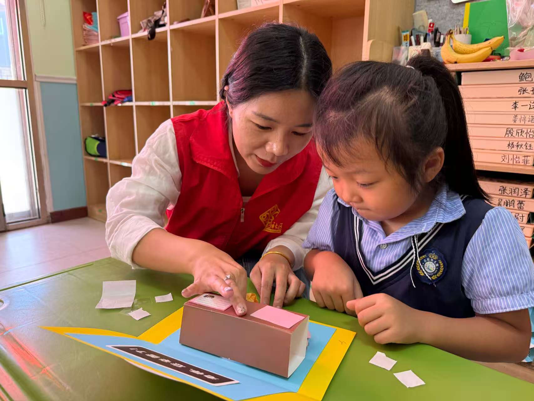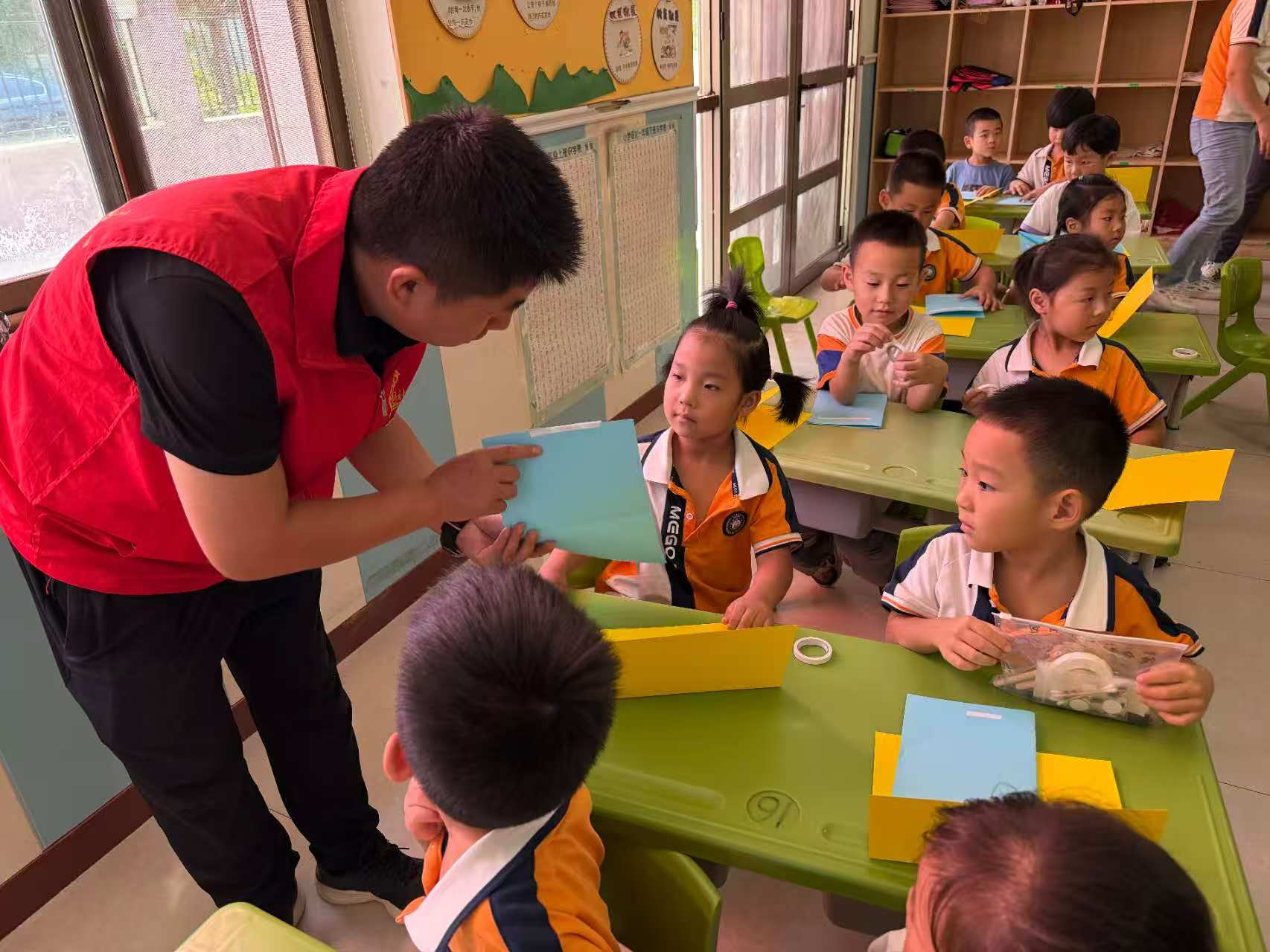 走进教室,孩子们亮晶晶的眼睛中满是对老师的崇拜与喜爱。当社区工作人员拿出彩纸、胶水、彩笔等材料时,“我要给张老师做一朵小花”“我要给李老师画一幅画”......孩子们你一言我一语,用稚嫩的声音表达着对老师最纯粹的心意。
