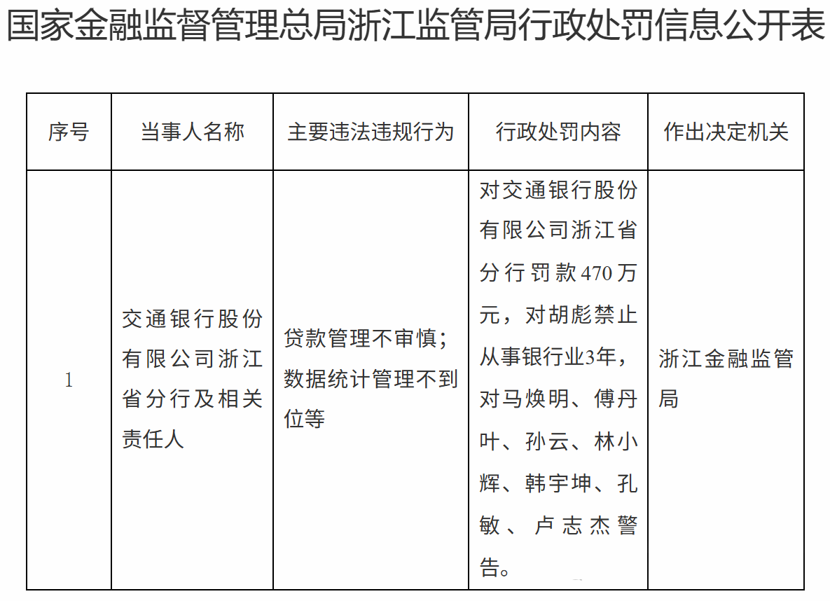 9月5日,浙江金融监管局行政处罚信息公开表显示,交通银行股份有限公司(下简称“交通银行”)浙江省分行因贷款管理不审慎、数据统计管理不到位等,被罚款470万元。