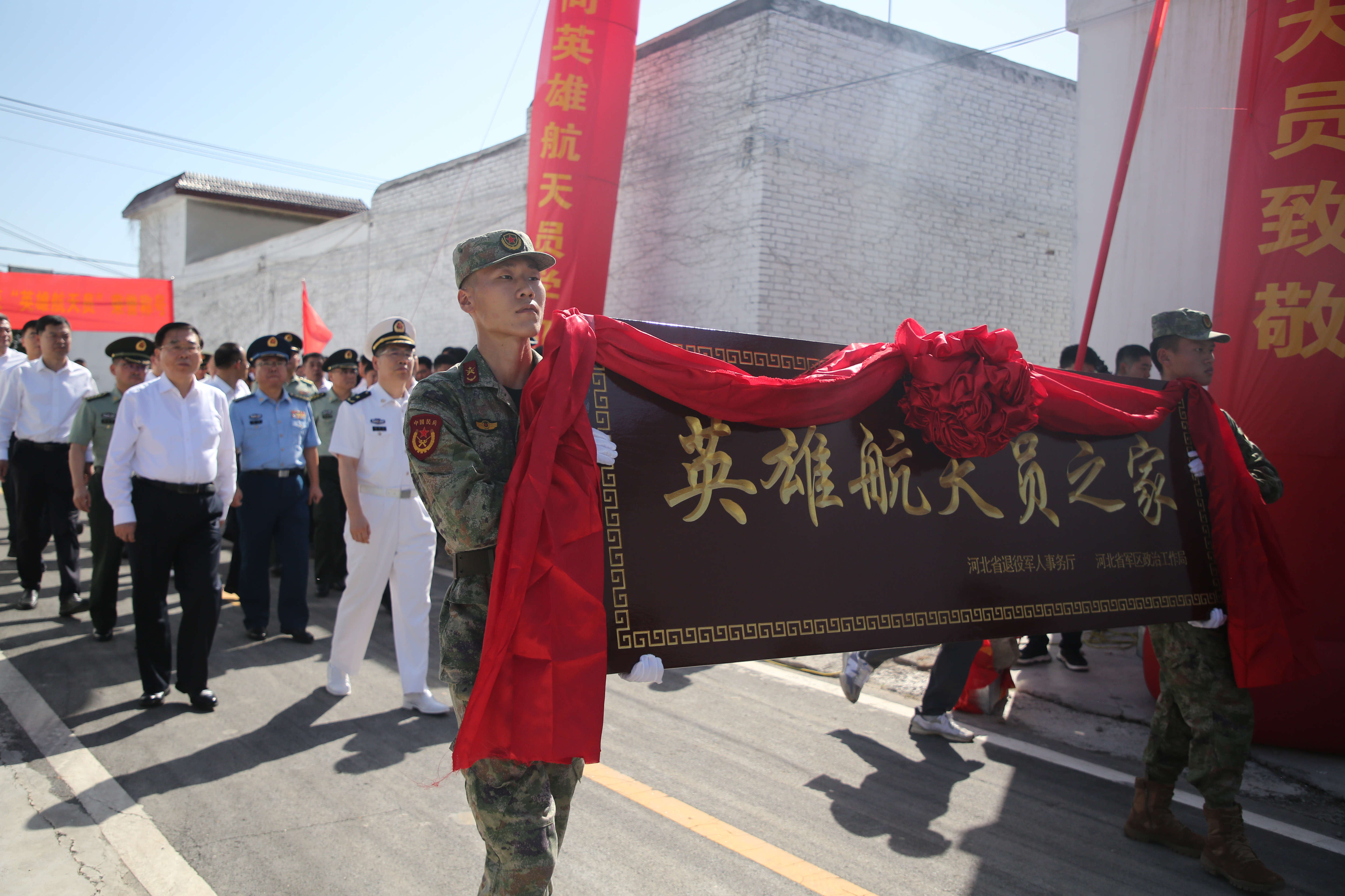 由河北军地有关单位和部门组成的立功受奖“报喜团”来到“英雄航天员”李聪的家乡南旺村