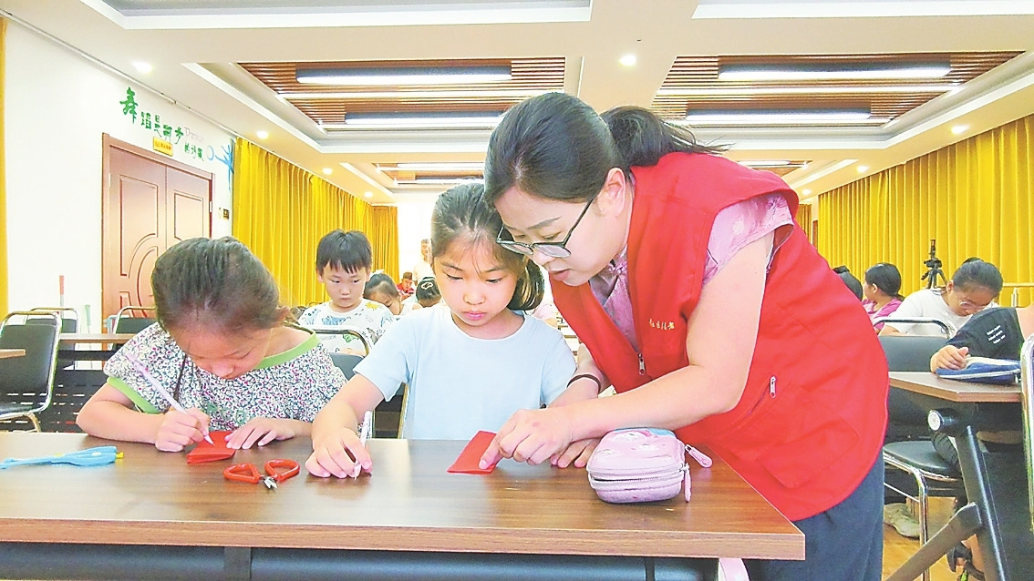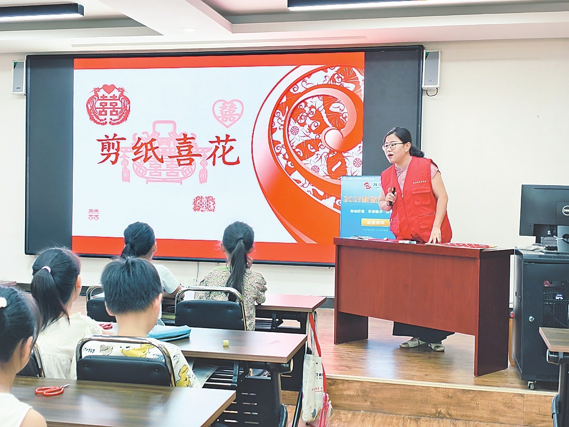 在社区公益讲堂上,志愿者老师为孩子们上剪纸手工课。