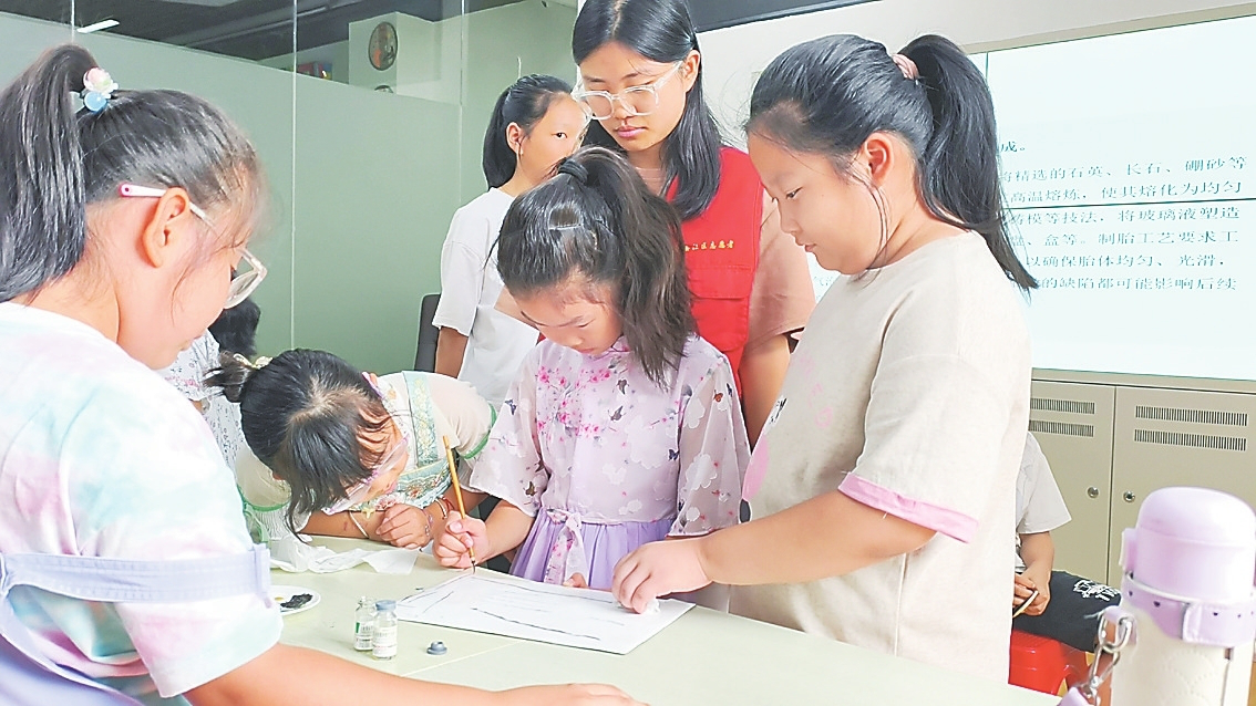 孩子们体验料胎画珐琅绘制。