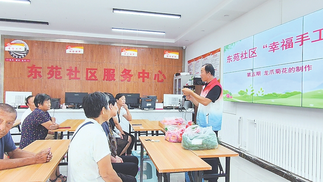 社区讲堂上,景县东苑社区工作者为大家讲解手工花制作。