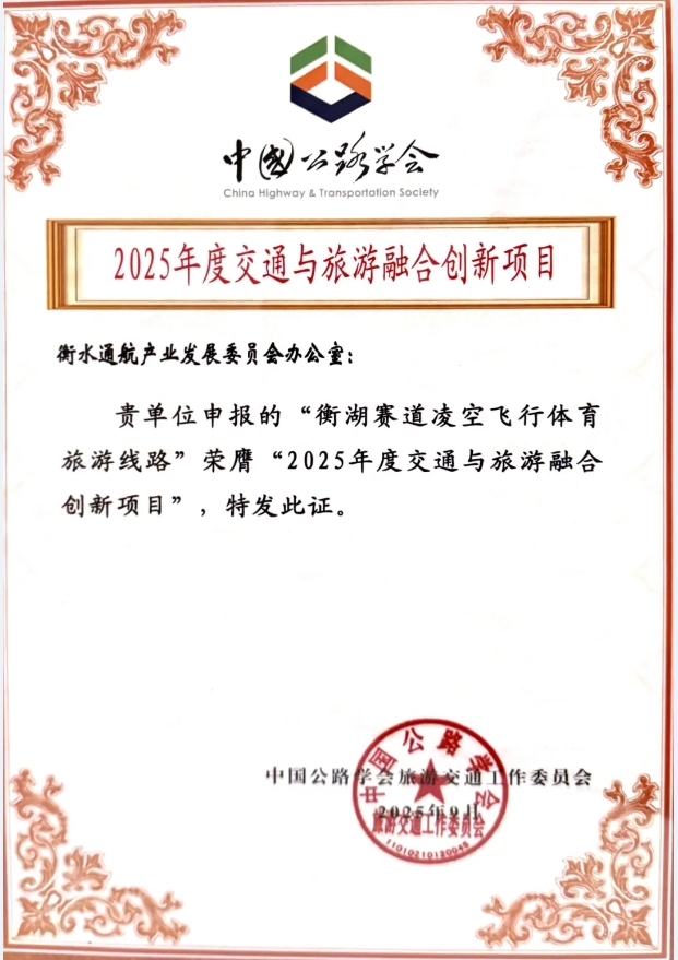 9月11日,第八届中国旅游交通大会在湖北宜昌召开。会上,“衡湖赛道凌空飞行体育旅游线路”成功入选全国“2025年度交通与旅游融合创新项目”,成为此次大会唯一一个以低空类别获奖的项目,是河北省唯一获此殊荣的项目。这一成绩不仅是衡水在交通旅游融合领域的重大突破,更是对创新发展模式的高度认可。
