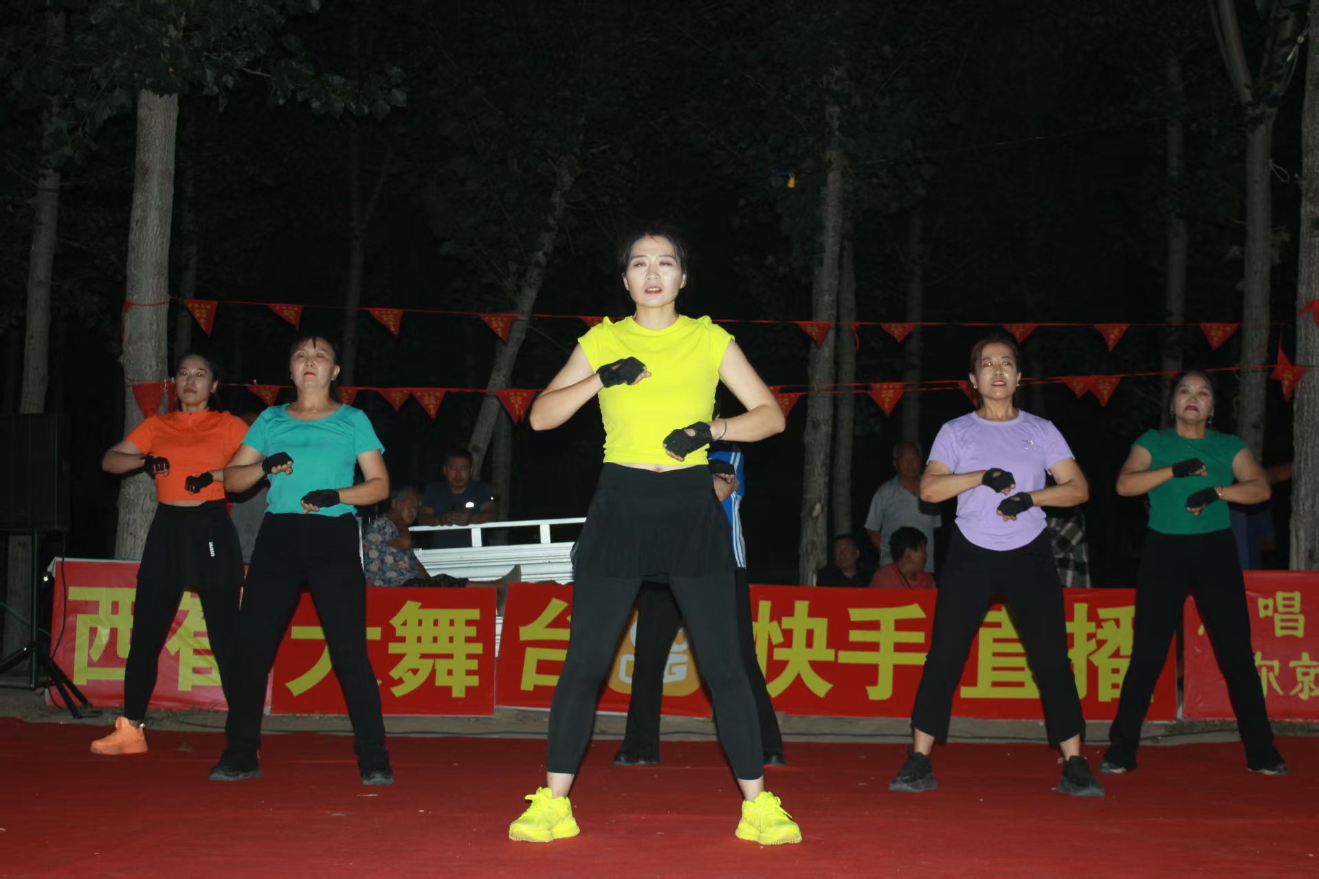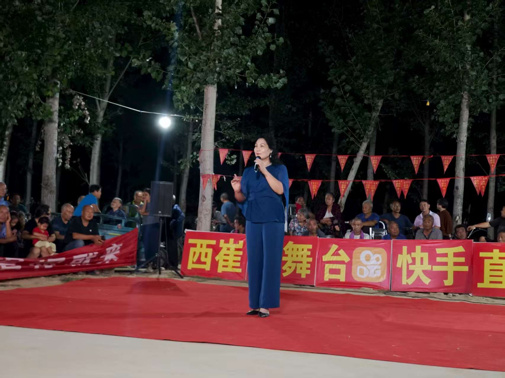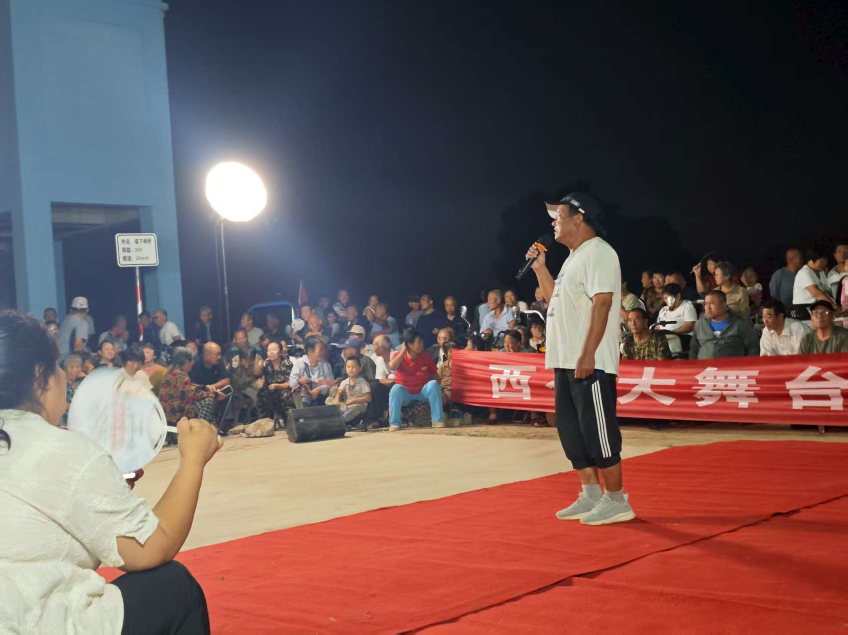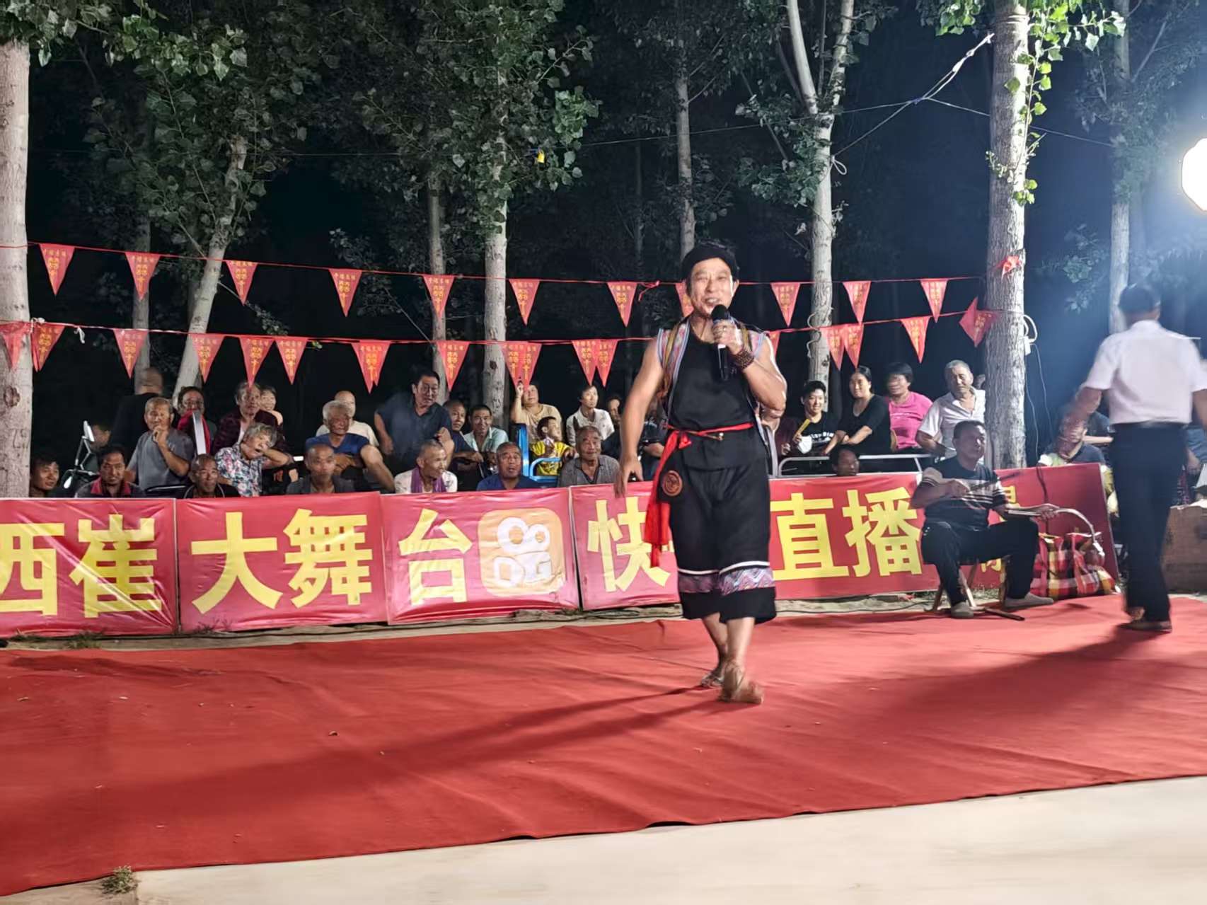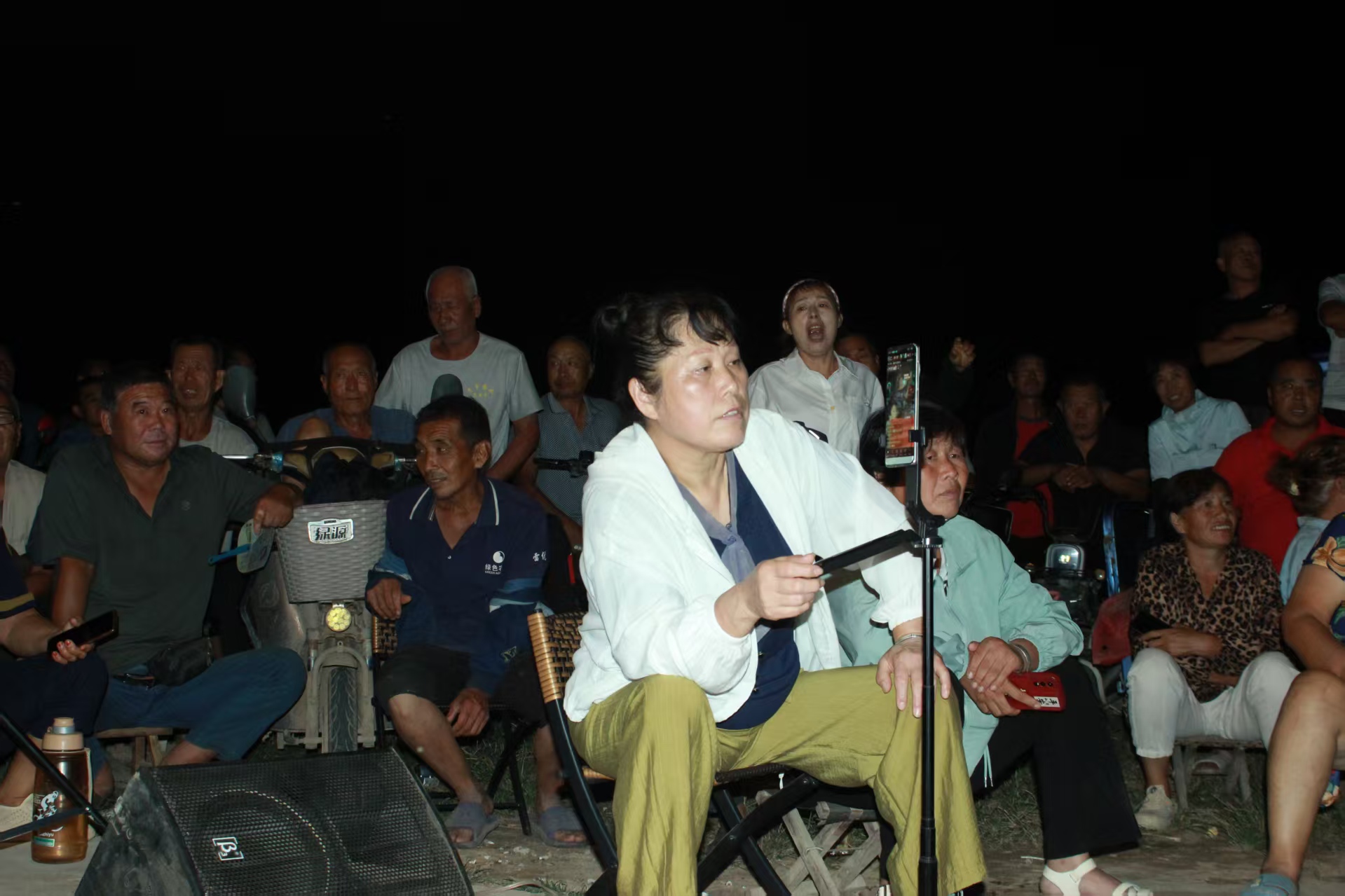 狮子退场后,戏曲《贵妃醉酒》选段紧接着登台。演员郭琴琴唱腔婉转,台下老人跟着轻哼,熟悉的旋律在夜色中飘荡。随后登场的王同岳镇杨君道村村民董志树,一开口就把氛围带向高潮——这位53岁的葡萄种植户,唱了一首歌曲《我的快乐就是想你》,底气十足。“我从小就喜欢唱歌,自从8月6日这个舞台搭建后,我就天天来,乡亲们热情、组织周到,看着大伙儿的笑脸,我这心里也亮堂。”董志树笑着说,现在各村里不少种大棚的乡亲,忙完农活就往这儿来,再也没人说“晚上没事干”,大家都觉得日子充实多了。