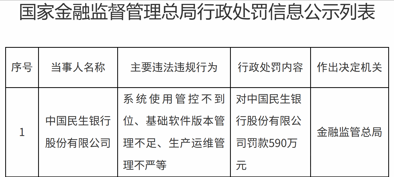 9月12日,国家金融监督管理总局行政处罚信息公示列表显示,中国民生银行股份有限公司(下简称“民生银行”)因系统使用管控不到位、基础软件版本管理不足、生产运维管理不严等,被罚款590万元。
