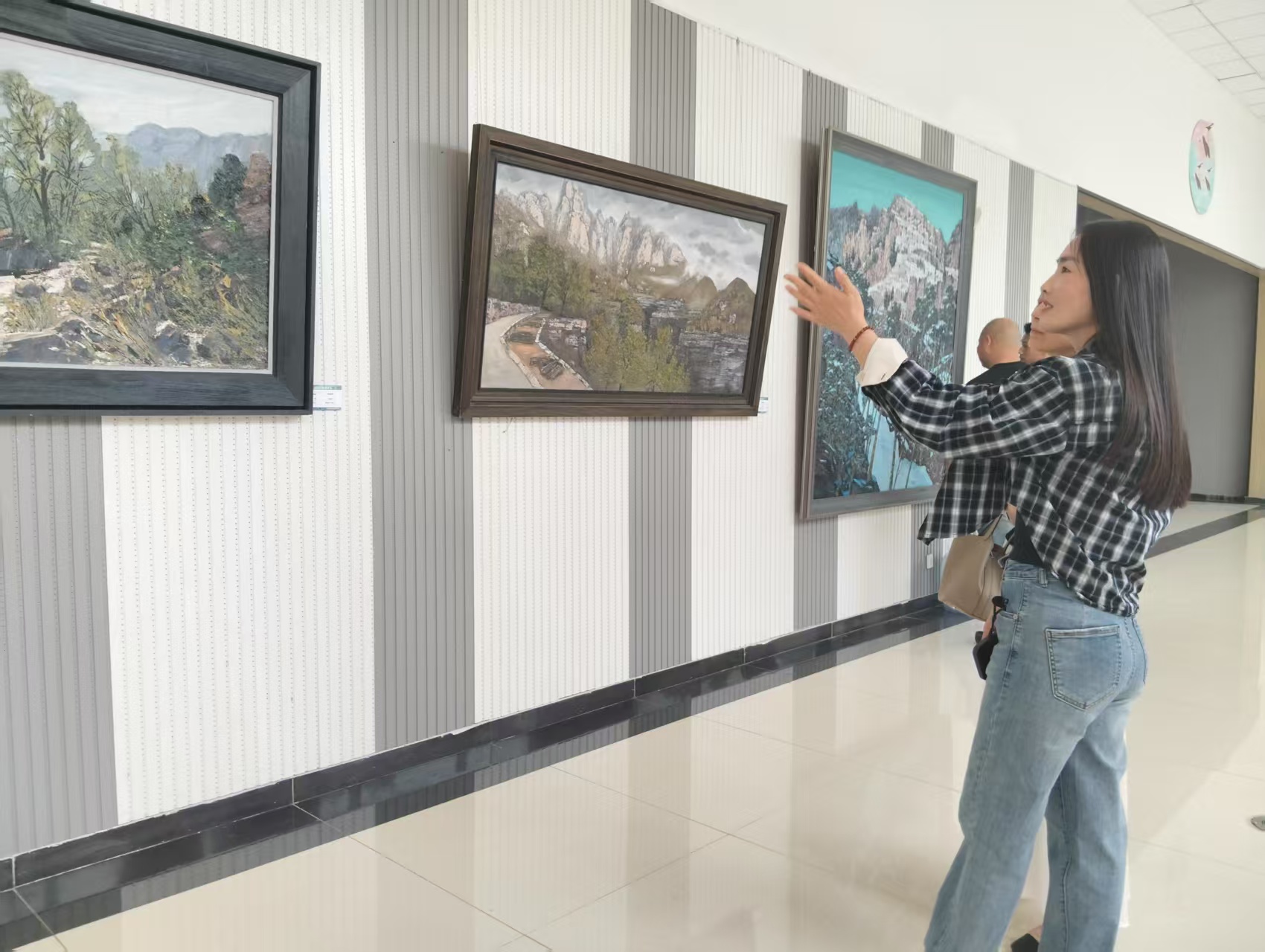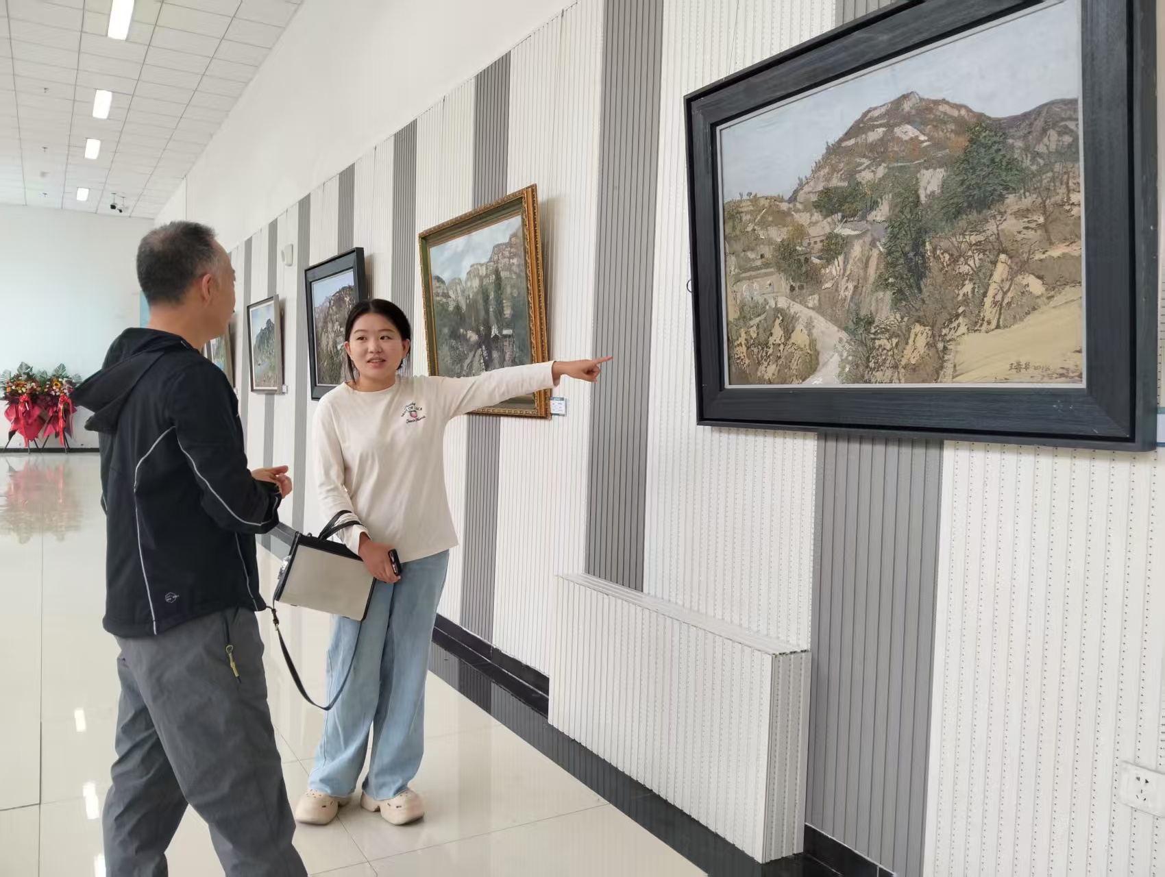 此次展出的油画作品,多以“山水”为主题,独特的创作手法和画风,深受现场参观者的好评。一位来自山西吕梁的女孩在《秋染郭家沟》前站立许久,感慨“这就是我家乡的样子”,激情点赞作者“老家的山就是这样像刀削一样,树就是这样一团一团的,还有这门帘、门框……您画得太像了”。