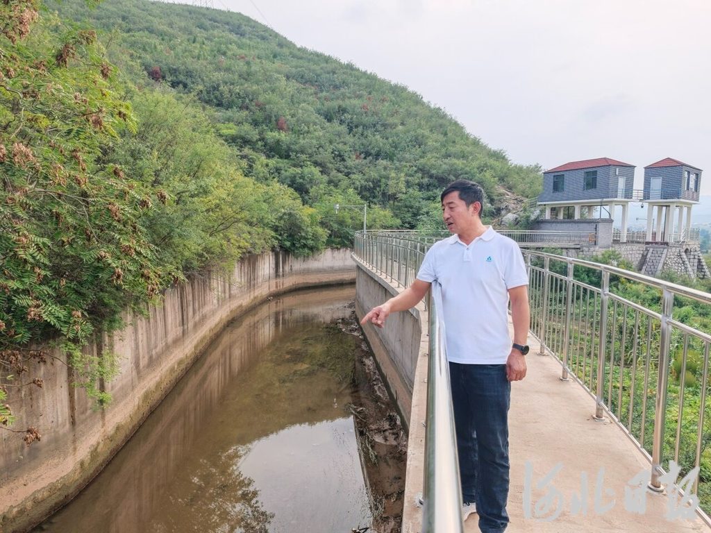 9月4日,在跃峰渠险峰渡槽附近一处渠道,跃峰渠管理处调水科科长邢彦生介绍调水情况。河北日报记者魏雨摄