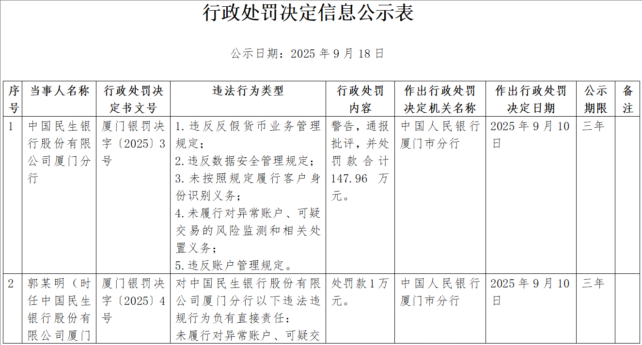 9月18日,中国人民银行厦门市分行行政处罚信息公示表显示,中国民生银行股份有限公司(下简称“民生银行”)厦门分行存在以下5项违法行为类型,被警告,通报批评,并处罚款合计147.96万元。
