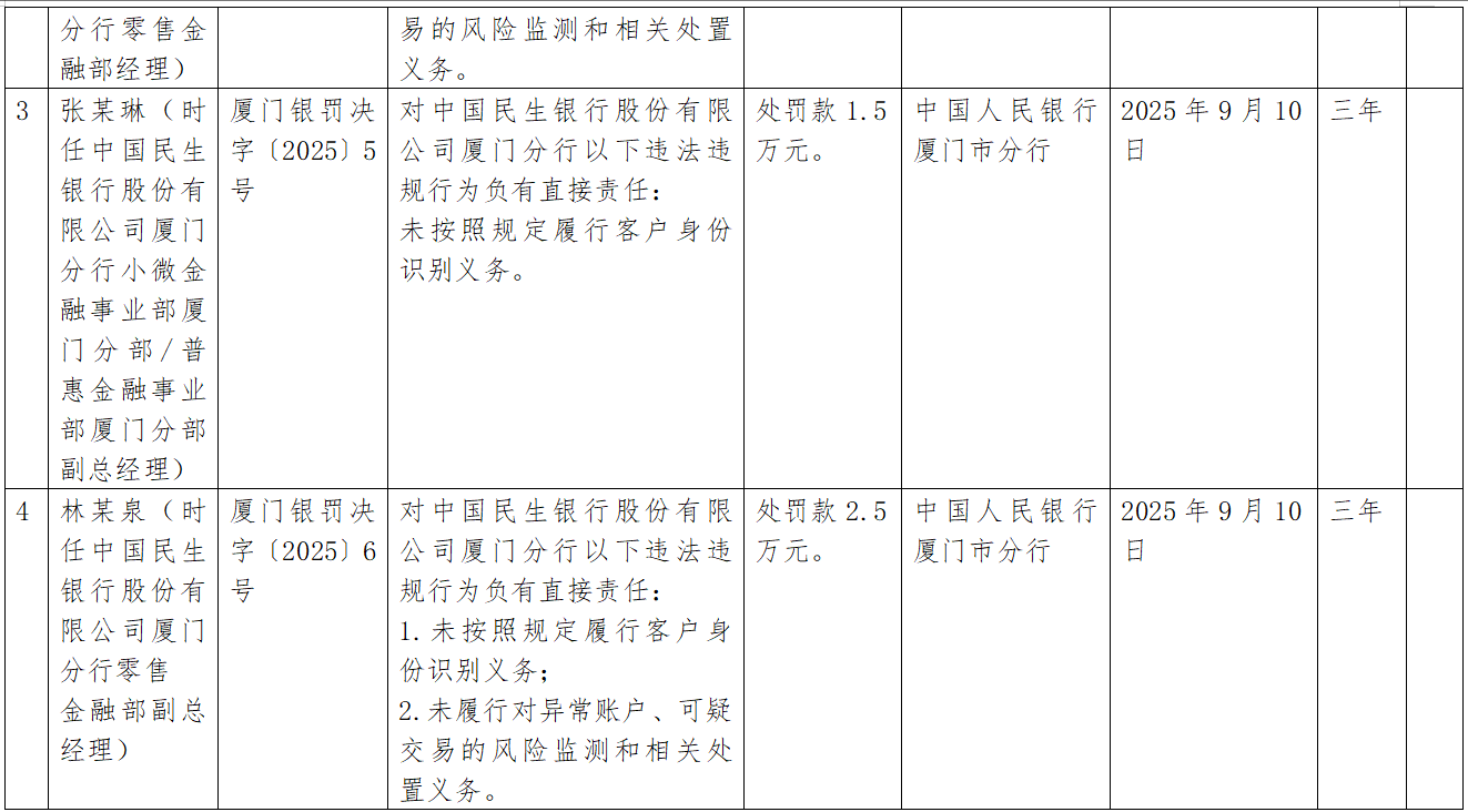 同时,时任民生银行厦门分行零售金融部经理郭某明对该行未履行对异常账户、可疑交易的风险监测和相关处置义务负有直接责任,被罚款1万元;时任民生银行厦门分行小微金融事业部厦门分部/普惠金融事业部厦门分部副总经理张某琳对该行未按照规定履行客户身份识别义务负有直接责任,被罚款1.5万元;时任民生银行厦门分行零售金融部副总经理林某泉对该行未履行对异常账户、可疑交易的风险监测和相关处置义务,未按照规定履行客户身份识别义务负有直接责任,被罚款2.5万元。