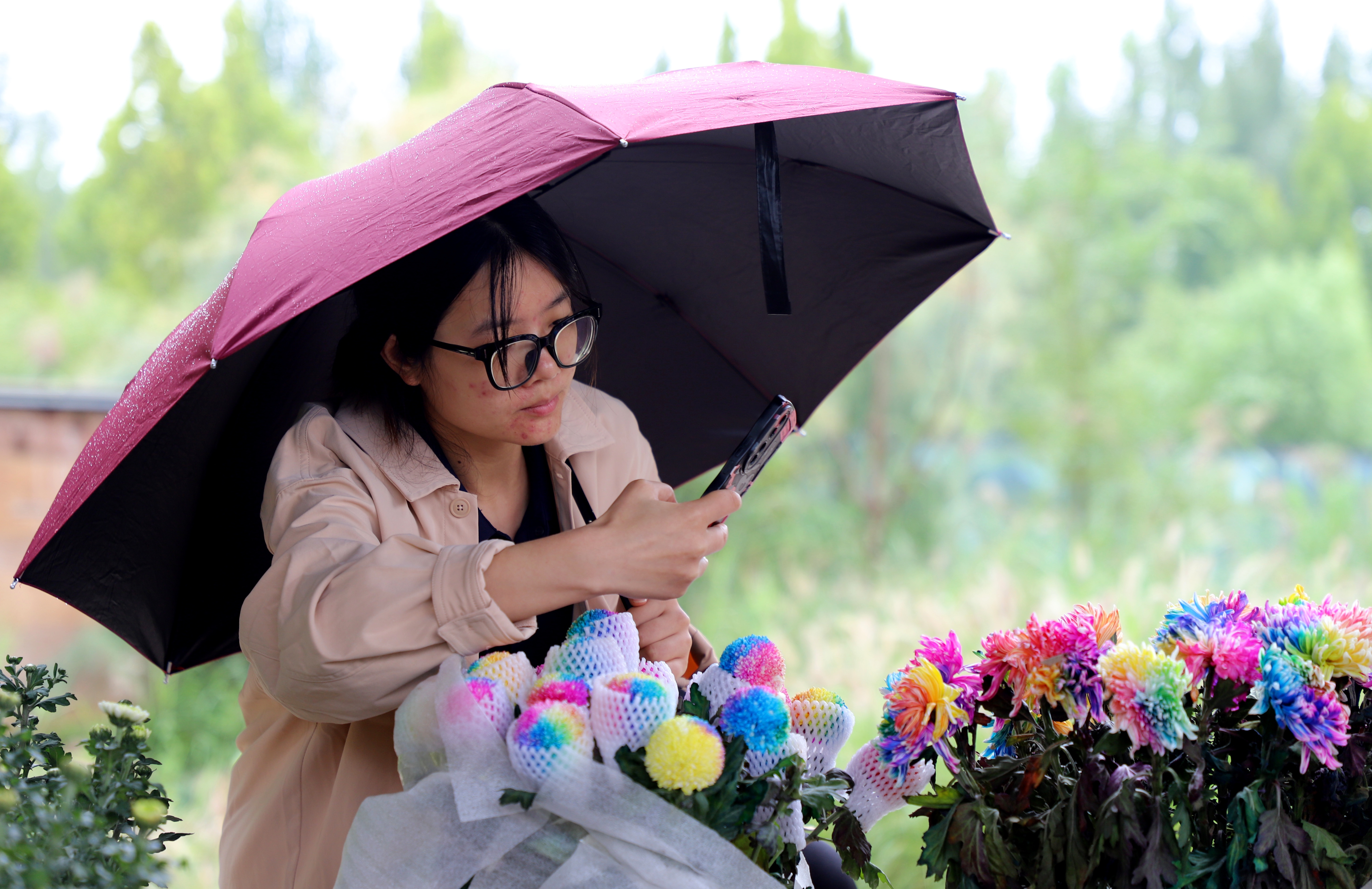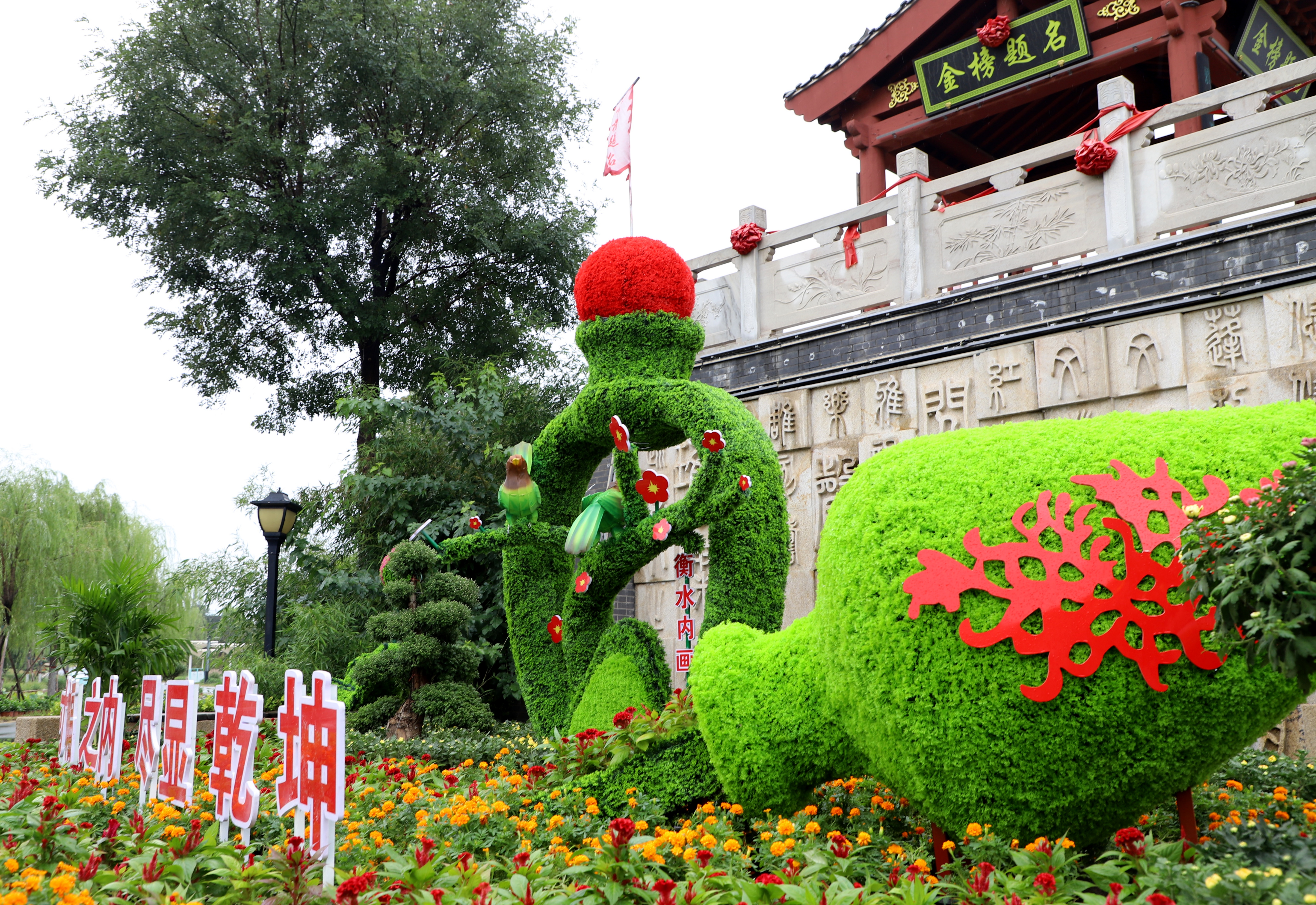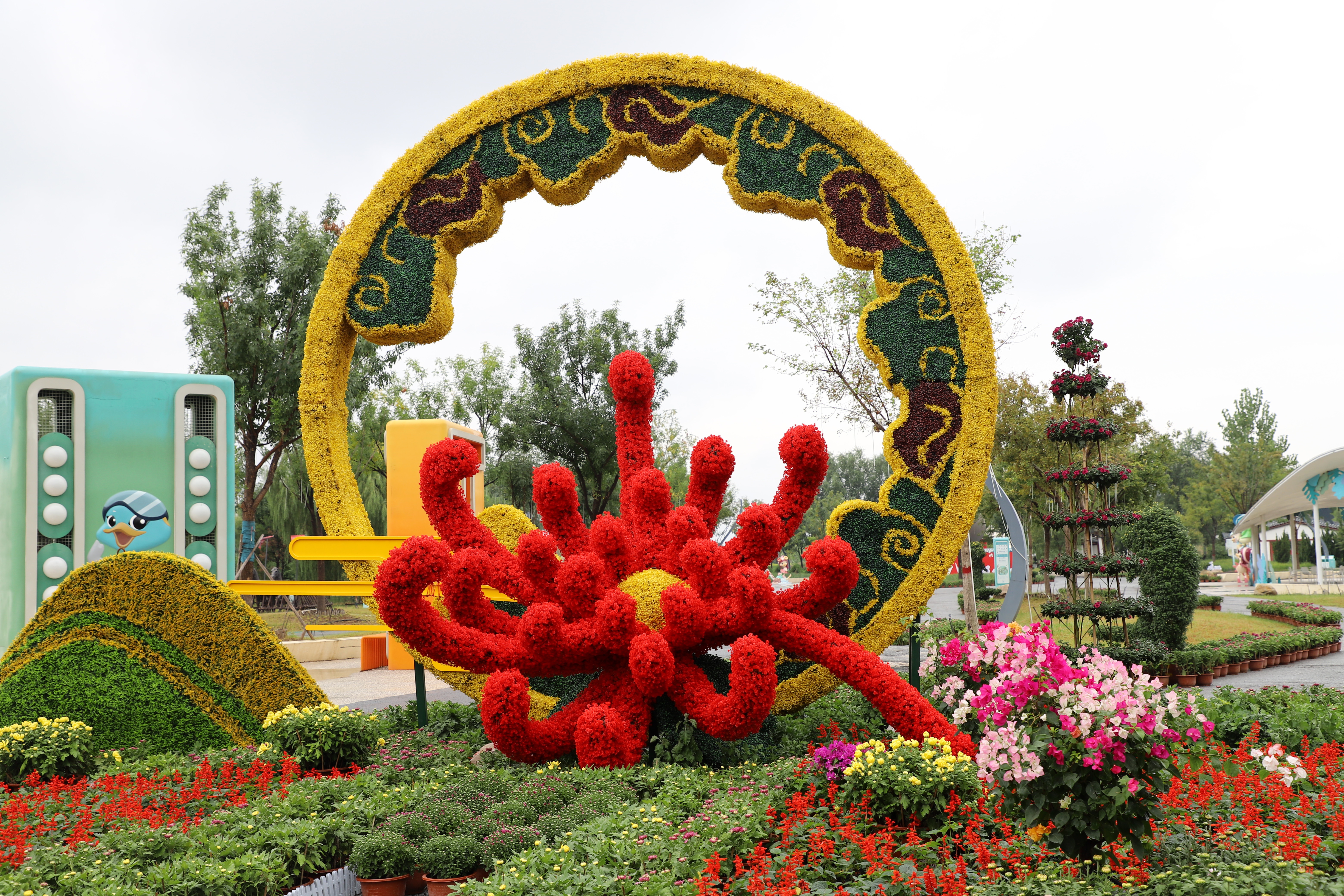 步入展区,造型各异的菊花景观小品映入眼帘,色彩明艳的大型菊花造型拱门 ,尽显巧思。菊花品种丰富多样,既有洁白素雅、带水珠的白菊,也有花瓣绚丽多彩的七彩菊。巧妙造型的菊花景观,吸引众多游客驻足拍照。