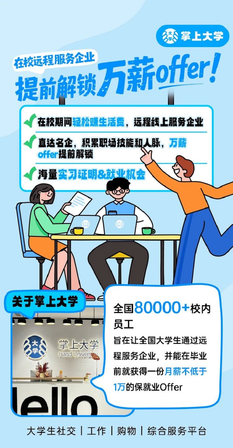 掌上大学推出的“万薪 Offer”计划,规定累计满 12 个月,大学生可获得掌上大学及合作企业提供的毕业后不低于 1 万元底薪的入职 offer。这一举措为大学生们提供了明确的职业发展方向和稳定的经济保障。在获得万薪 offer 之前,大学生们作为校园代理,每月还能获得不低于 1000 元的无责底薪以及销售佣金。在获取收入的同时,他们还能得到全方位的锻炼。通过推广销售平台商品,如护肤品、食品等学生高频消费品,大学生们能够提升自己的市场营销能力、客户沟通能力以及问题解决能力。在日常维护客户关系,做好学生用户售前、售中、售后全程服务的过程中,他们又能培养自己的服务意识和责任心。更为重要的是,实习期间的全程运营指导手把手教学,能让他们轻松 GET 电商运营、社群运营、营销推广等技能,为未来的职业发展打下坚实的基础。