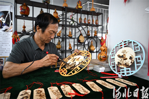 9月16日,在邢台市抗大1940街区非遗工坊,木板烙画技艺传承人卢金芳现场展示木板烙画技艺。