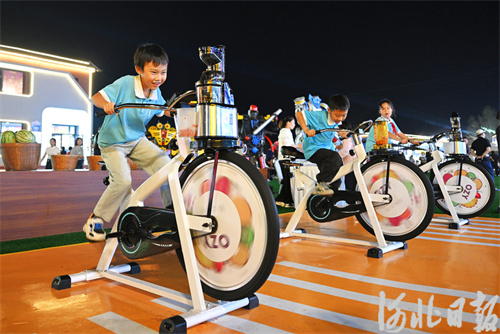 9月15日,在“县”在出发·河北县域特色产业赋能文旅市集上,小朋友体验自行车健身器材。