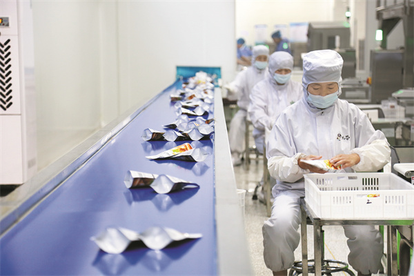 在百峰贸易有限公司生产车间,工人正在打包板栗深加工产品。