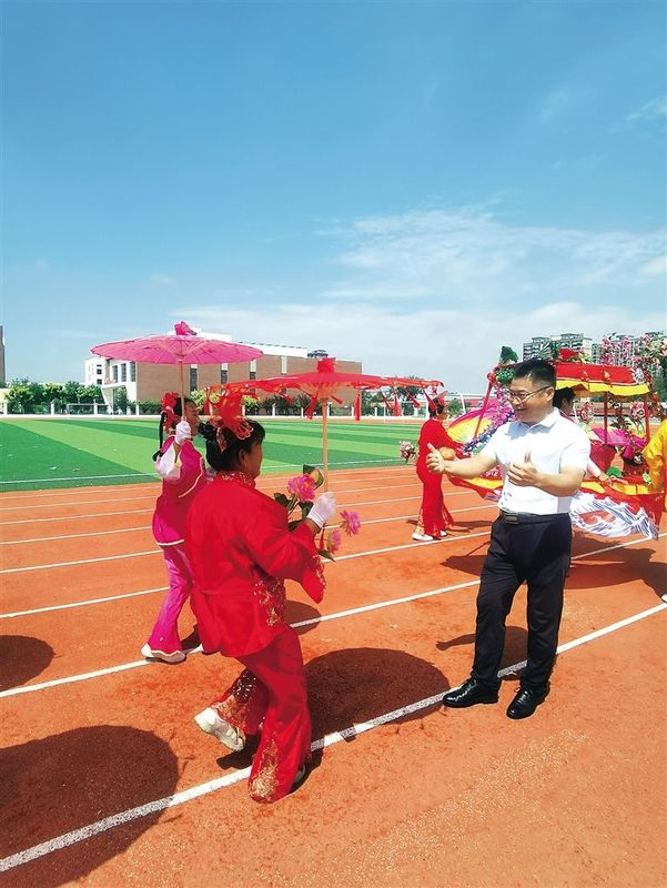 日前,在吴桥县第一初级中学运动场上,民间非遗巡游方队演员们正在热火朝天地排练。徐迎军走在队伍中,一边热情调动演员情绪,一边用夸张的示范动作点燃全场。演员们心领神会,表演越发精彩。