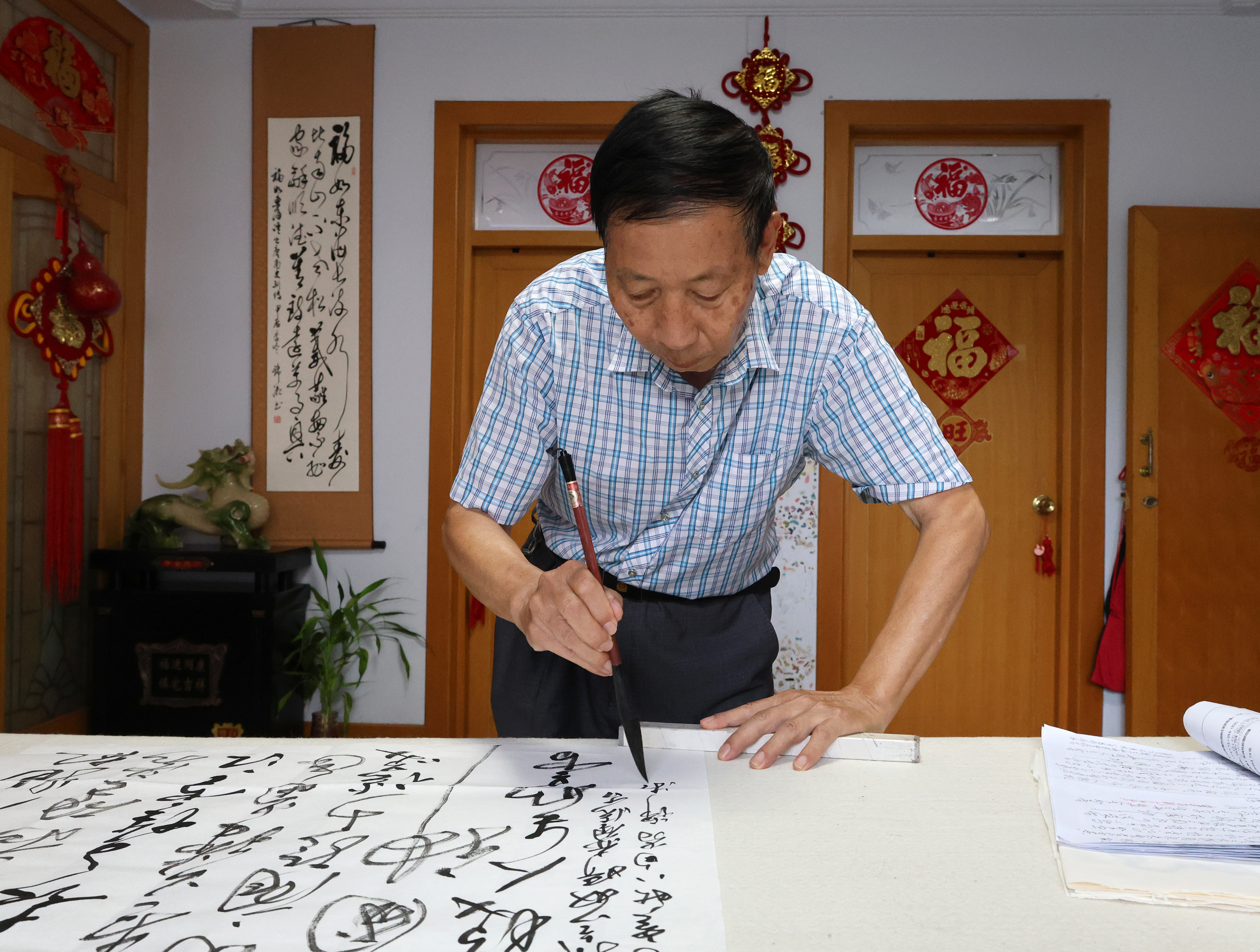 最让封锦湘自豪的,是2019年耗时两个多月完成的5部百米草书长卷。那段时间,他每天从早8时写到中午12时,下午2时写到傍晚6时,遇到生僻字时,仔细翻阅字典,最终,完成了《千字文》《千家诗》等5部长卷,最长的《千家诗》达110米。他装裱后拍成视频发到网上,引来众多网友点赞,不少书法爱好者还专程上门交流。“用草书传承传统文化,这是我最开心的事。”他说。