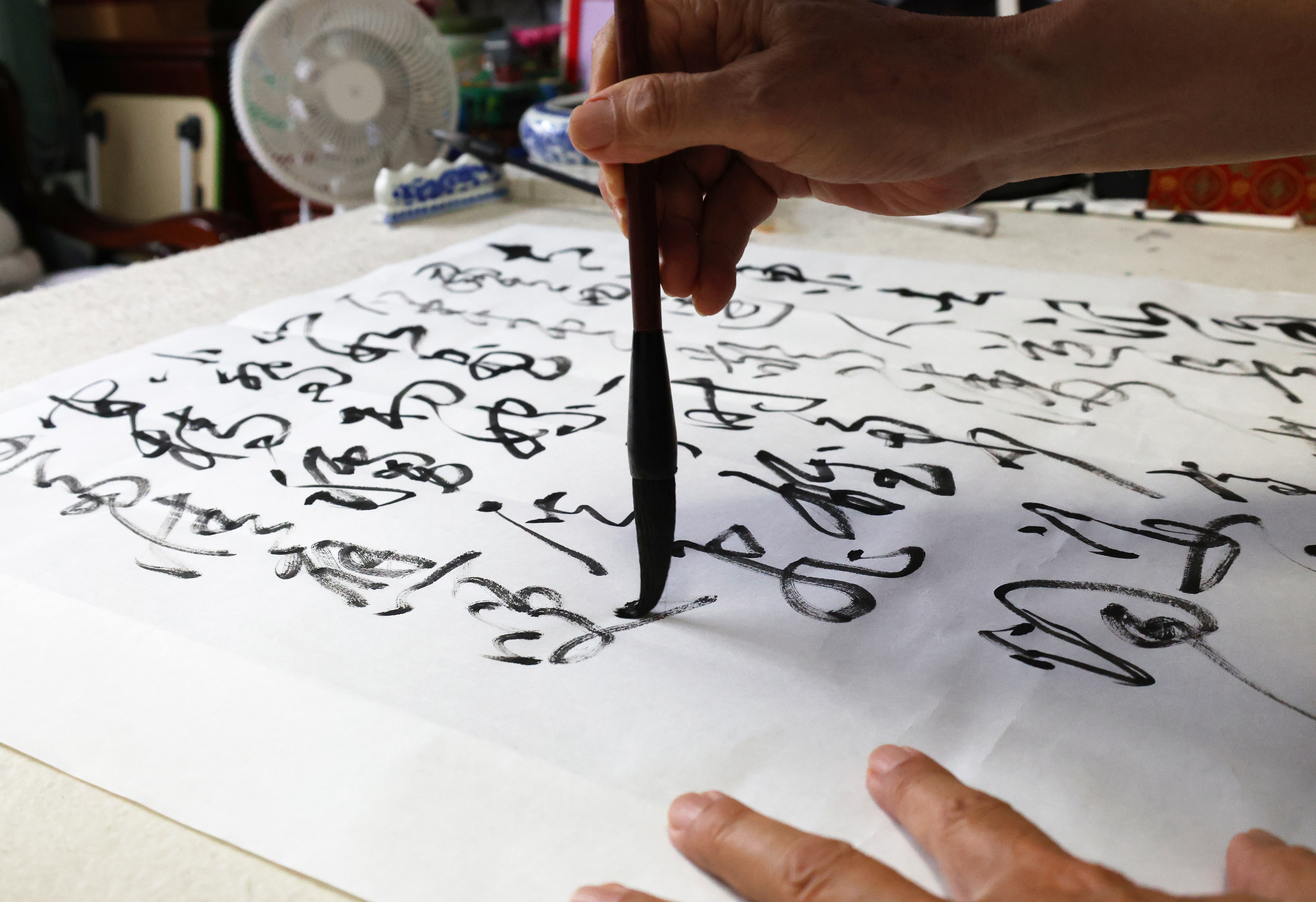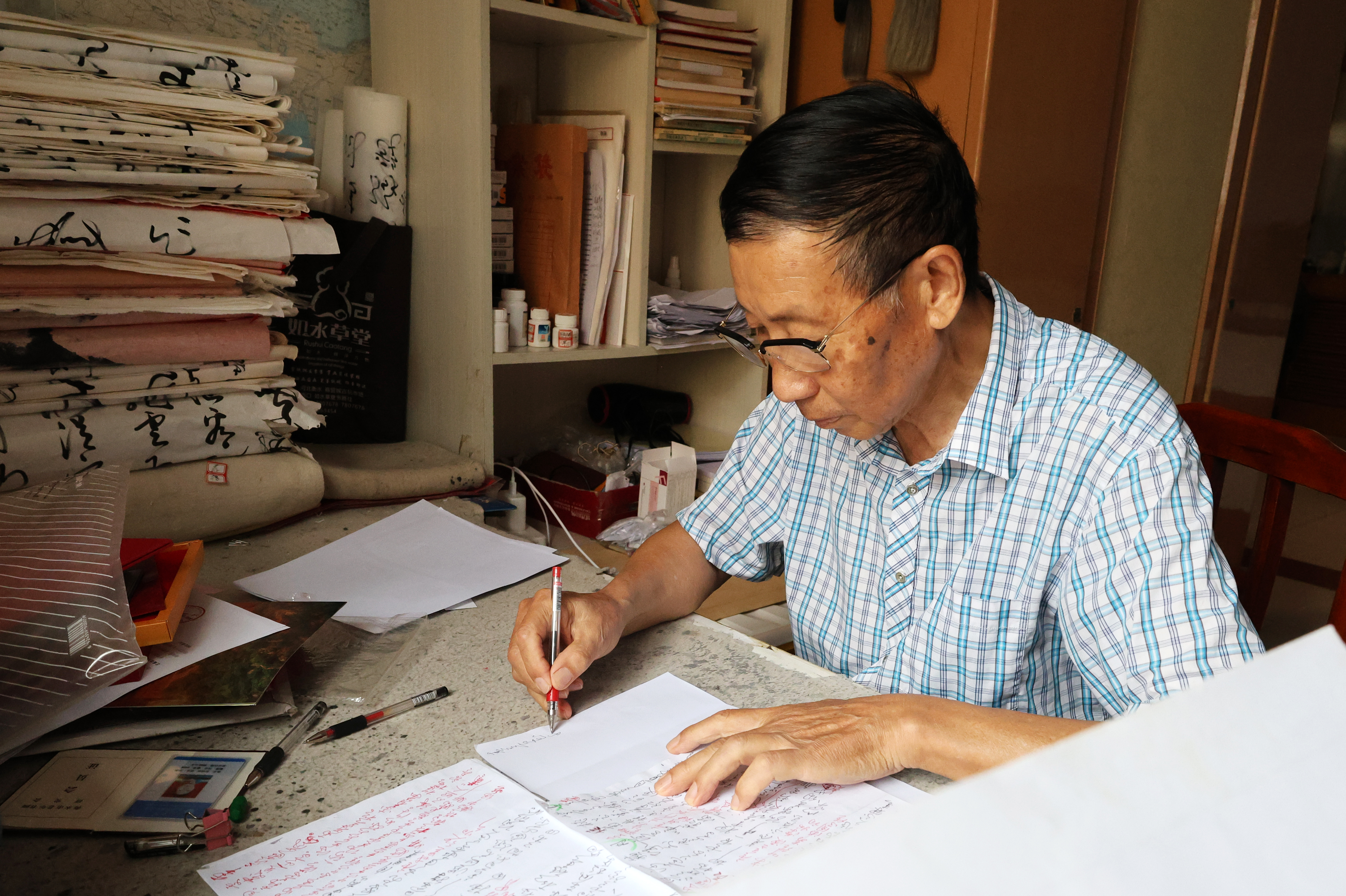 记者在他的卧室书桌上看到,桌子的最里侧堆放着一米多高的宣纸作品,每一张都叠得整齐,旁边还放着同样高度的草稿纸,密密麻麻的字迹上,红笔修改痕迹清晰可见。“这些都是近十年练的,床底下也装满了书法作品。”封锦湘笑着说,为打磨技艺,他从不在乎笔墨消耗,“能把草书写好,这点投入不算啥”。